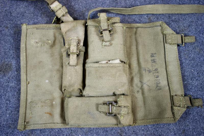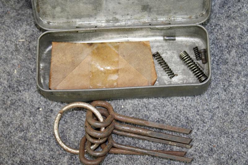 British Bren gun spare parts wallet which is maker marked M.W.&S.LTD for Martin Wright & Sons.Ltd. The wallet is dated 1943 and comes with a butt tool, spare parts tin with some gas port keys and springs. Pull-Trough, cleaning cloth and a oil bottle.