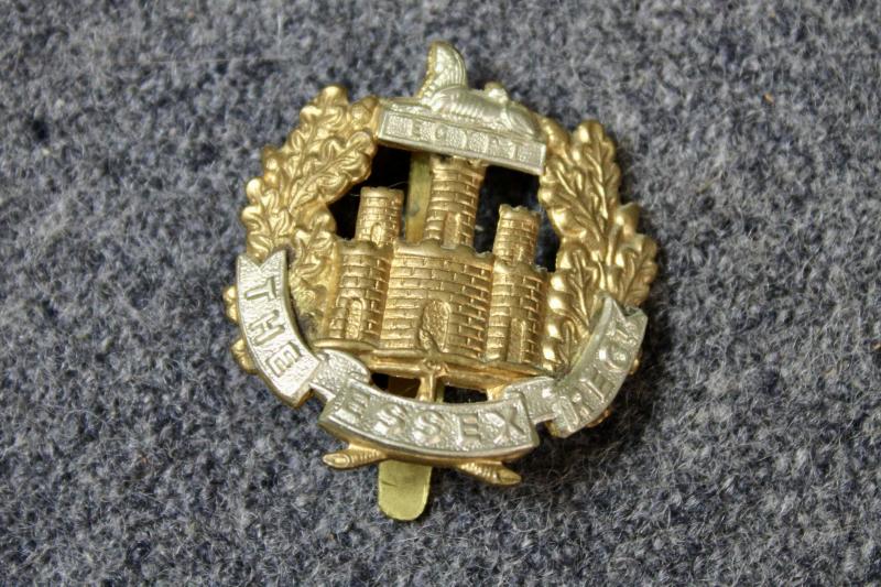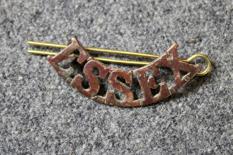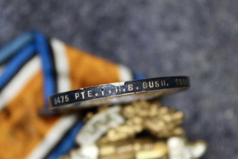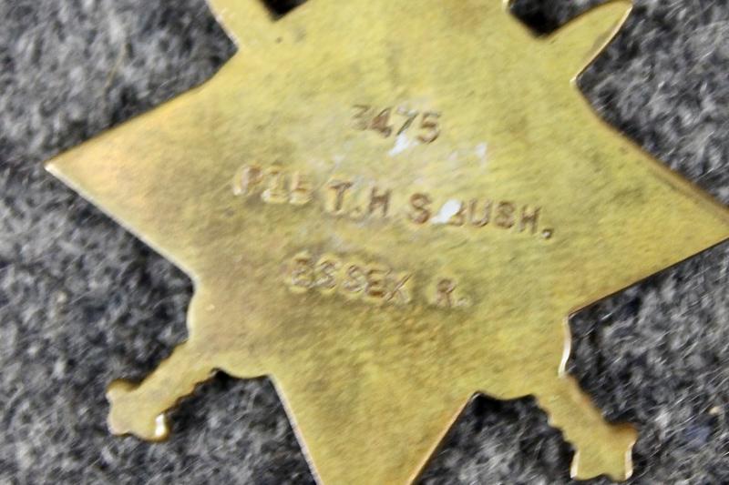 Twin medal group consisting of the 1914 star and War medals. Both medals are named to T.H.S. Bush, service number 3475, Essex Regiment. The medals also includes a Essex Regiment cap badge and epaulette Essex Regiment cypher.