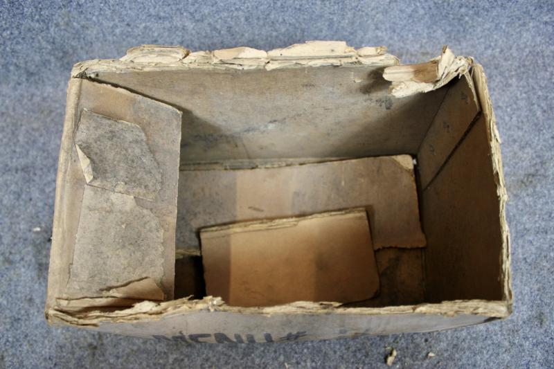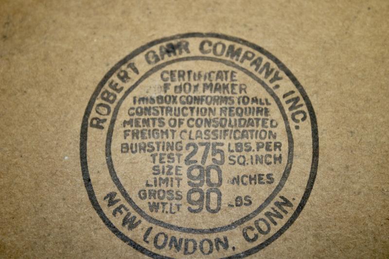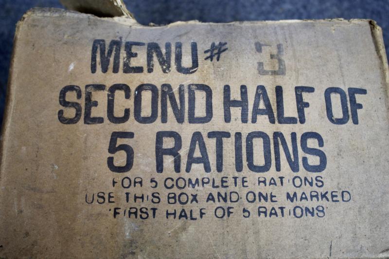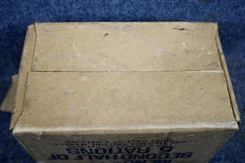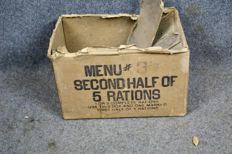 This is a cardboard ration box, which would have contained five packs of rations. This example is maker marked Robert Gair Company Inc.