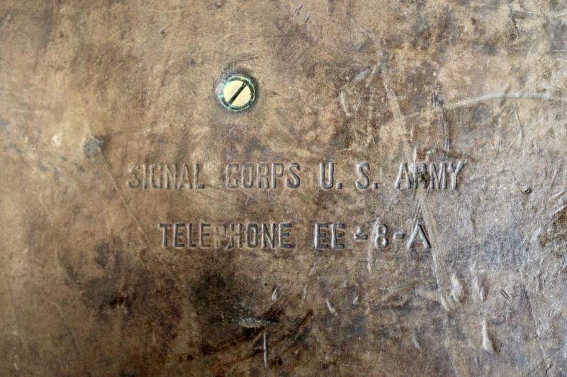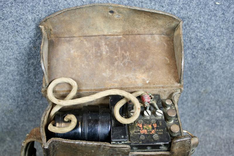 This is an EE-8-A field phone with a early TS-9 hand set. This example is in good condition however the fastener on the leather flap has gone.