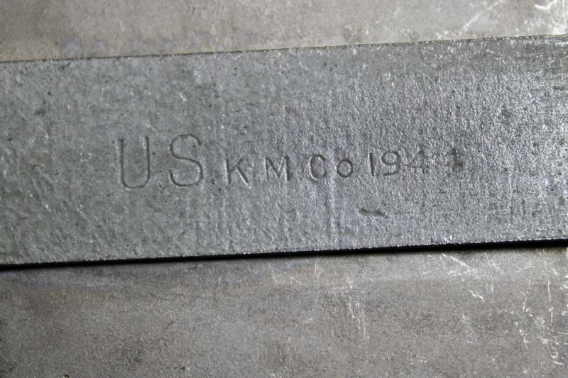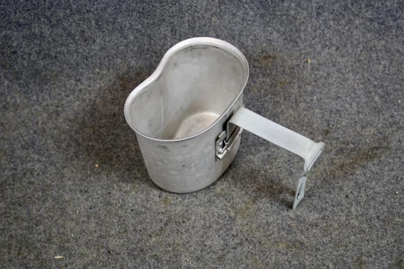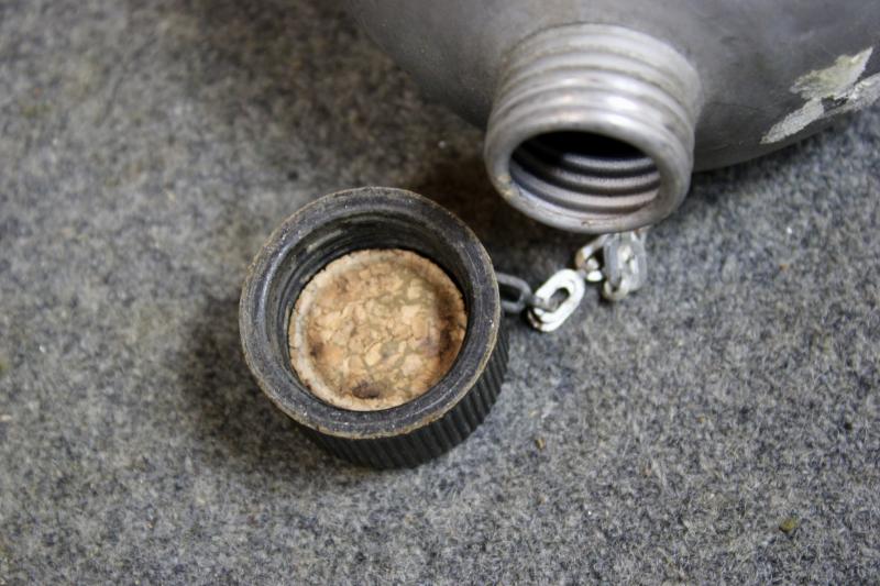 This is a 1944 dated water bottle set consisting of a M1942 water bottle, cup and a British made pouch. The water bottle is maker marked S.M.Co and the cup is maker marked K.M.Co. The Water bottle retains its original cork seal in its plastic cap and the pouch is maker marked MECo for Mills Equipment Company.