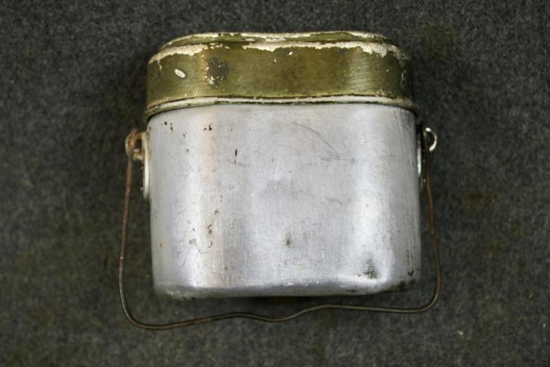 A set of matching M31 mess tins which the upper and lower parts are both maker marked 'ESB" and dated 1940. The upper part retains most of its green finish were the lower half has lost all its paint.