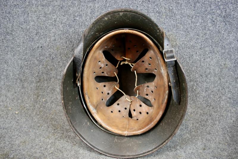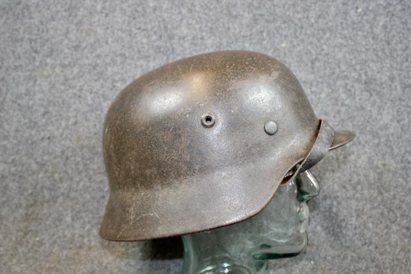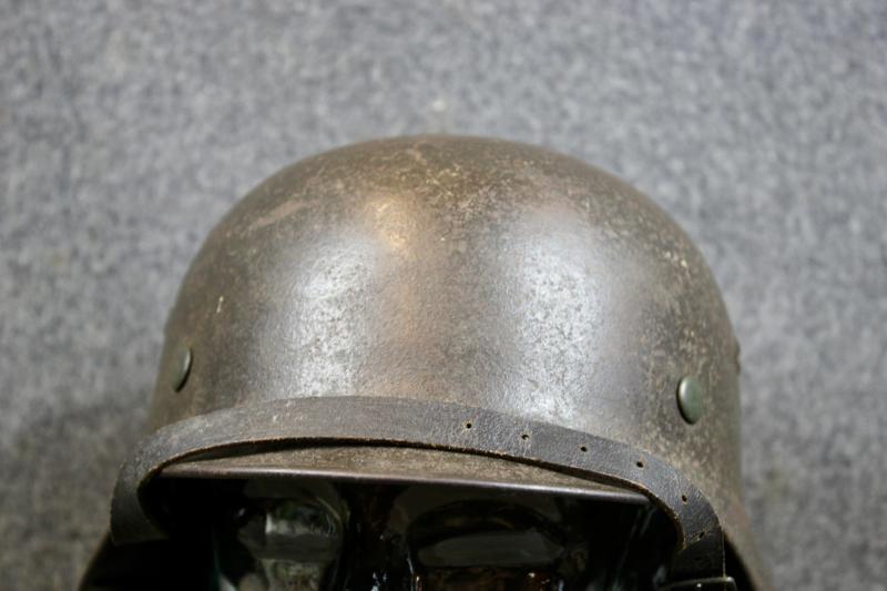 A nice untouched M40 helmet which has the batch number 21979 and the maker's code EF for Emailerwerke AG. The shell size is 66. The liner and chinstrap are both in excellent condition with the chinstrap maker marked and dated 1941.