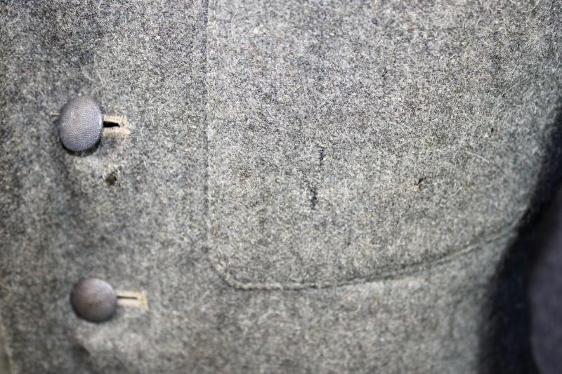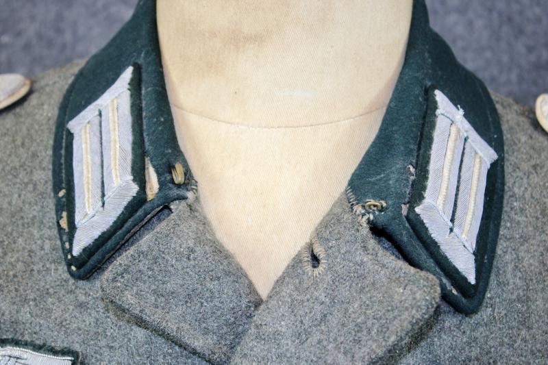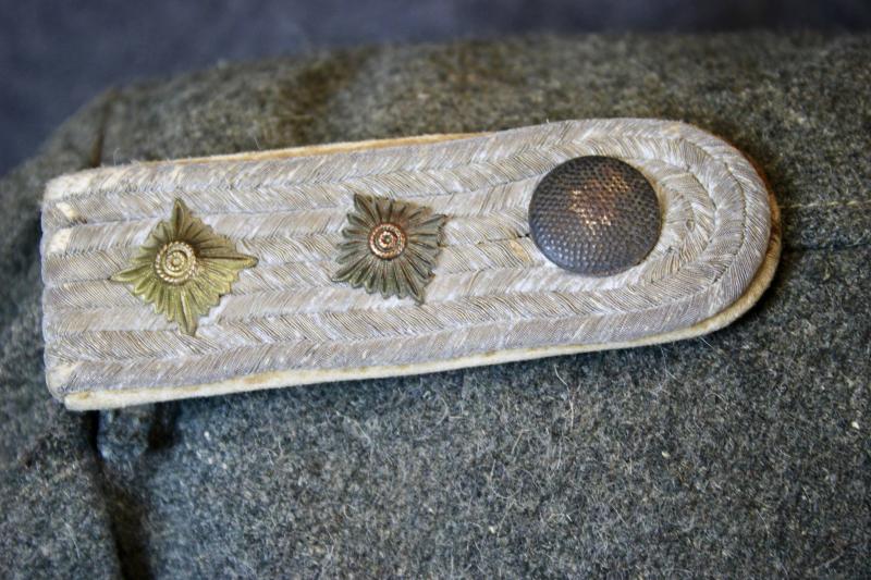 This in in fact a standard enlisted man's M43 tunic, which the officer wood have drawn form the stores. The collar has been replaced with a green collar and no other alterations has been done to the tunic, apart of the addition of officer insignia, breast eagle, collar tabs and shoulder boards. The collar tabs and shoulder boards have the branch of service piping white for infantry and the rank of Hauptmann ( Captain ). The collar has suffered with some moth damage especially around the collar tabs and the front of the tunic on the left side has also suffered with some minor moth nips. The rayon lining still clearing shows the size markings and the date of production 1944 ( R44 ).