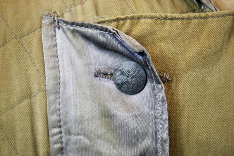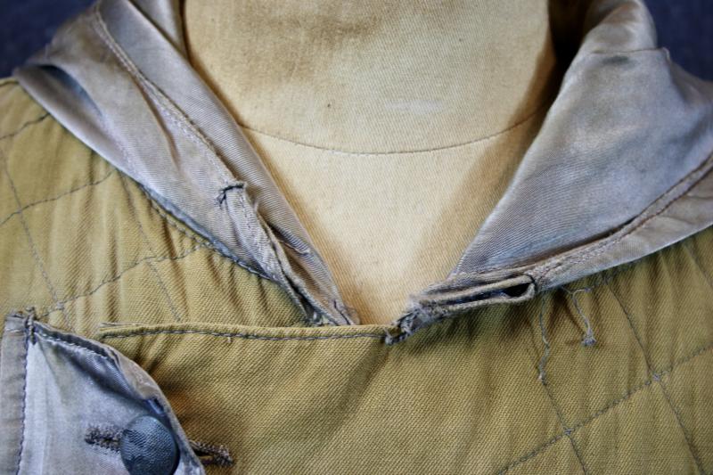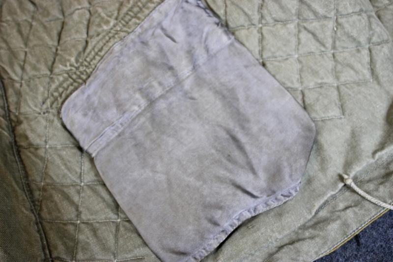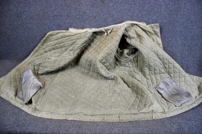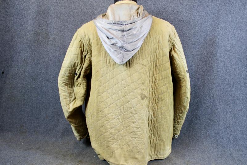 This is a non reversible quilted winter parka which has had a army breast eagle applied, which appears to be a period application. The parka is in very good condition with a rayon hood and frontal button flap. The draw-cord for the hood has been pulled out and is missing. Besides the missing draw-cord the parka is in very good condition.