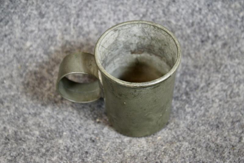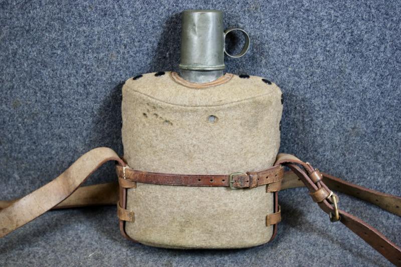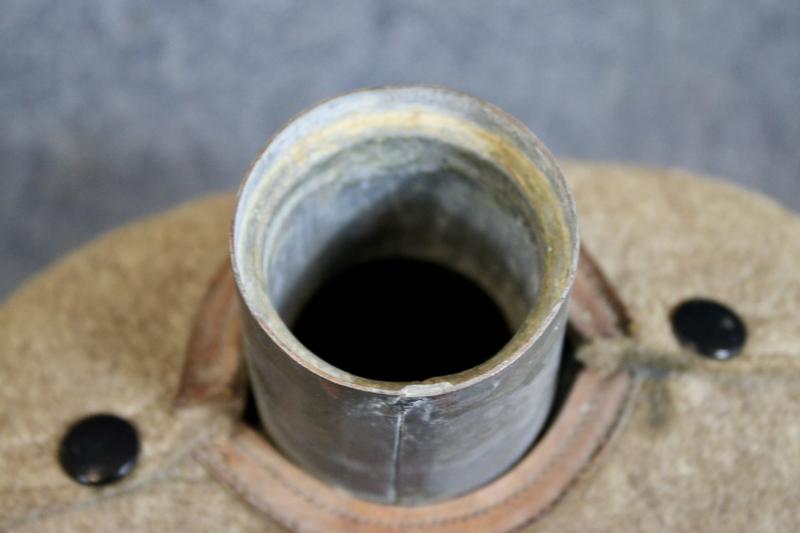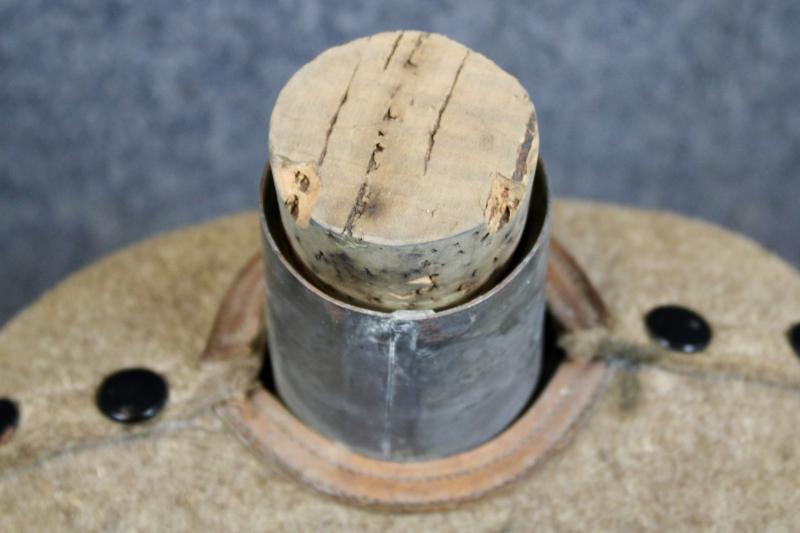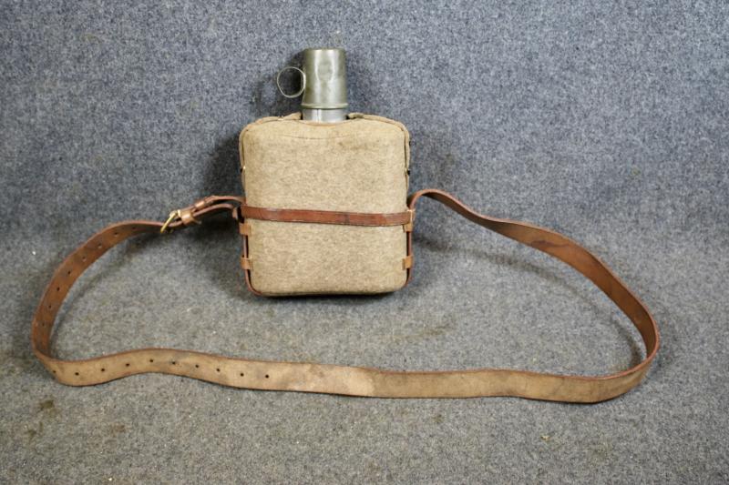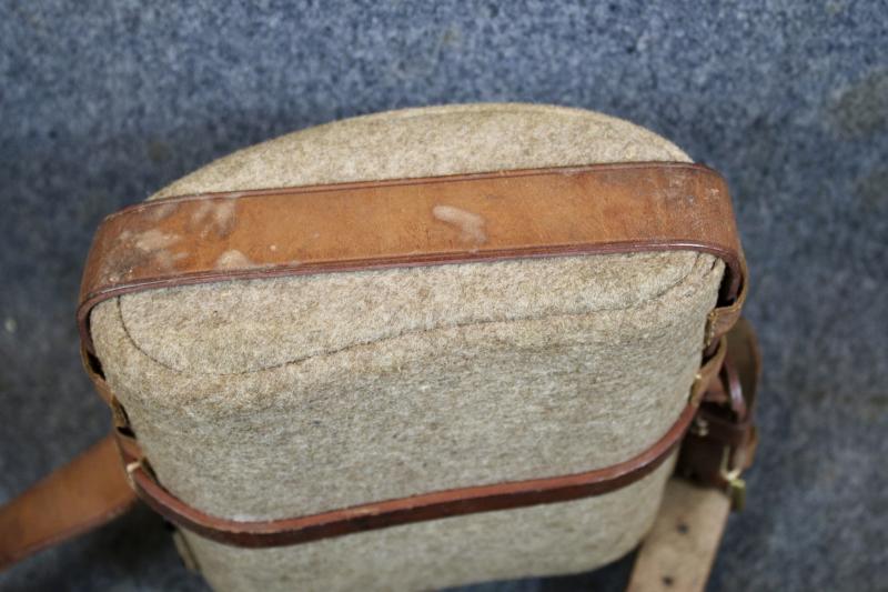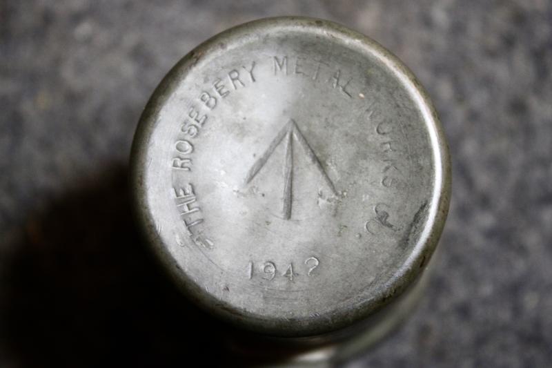 This is the rarer oversized medics water bottle with its own cup. This example has suffered with some minor moth damage to the front of the felt covering. The water bottle retains its cork stopper. The cup is maker marked 'The Roseberry Metal Works.Co and dated 1942.
