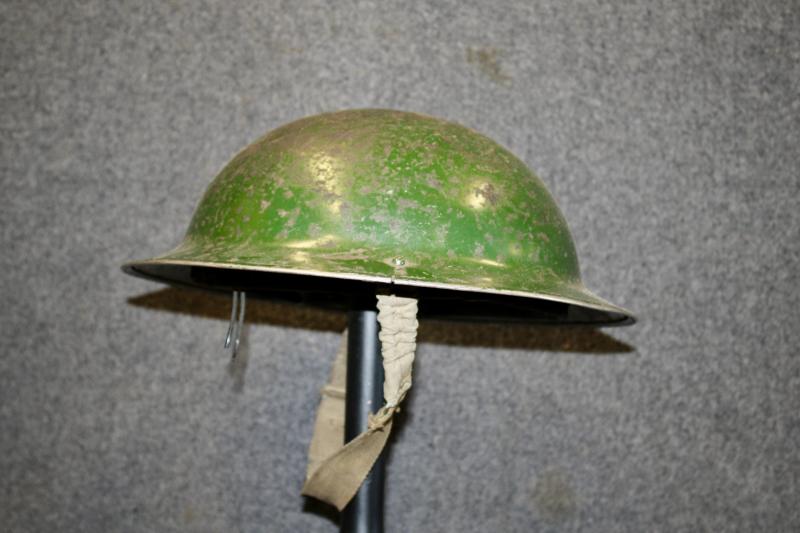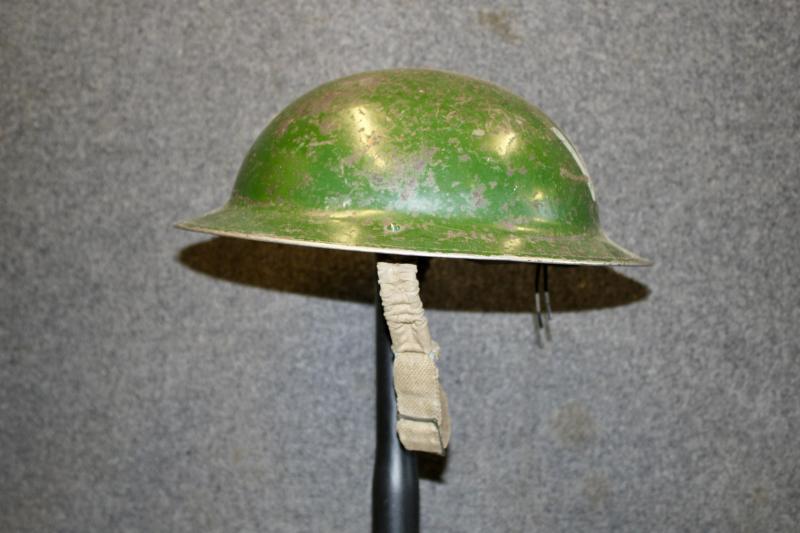 This is a British made MKII helmet, which supplied to the Republic of Ireland, which received over 60,000 helmets by the United kingdom during WW2 with a large number being supply to the Irish Civil Defence, which mirror its British counterpart. The Irish Civil Defence helmets where overpainted to reflect the branch of service. Red for fire, blue for rescue, white for casualty service, green for air raid wardens and police. This example is an air raid wardens helmet with the original British army khaki finish still visible on the inside of the shell. The liner is maker marked TTC for Teddy Toy Company, which produced liners from 1939 to 1942. It's size stamped 7.1/4 and dated 1940.