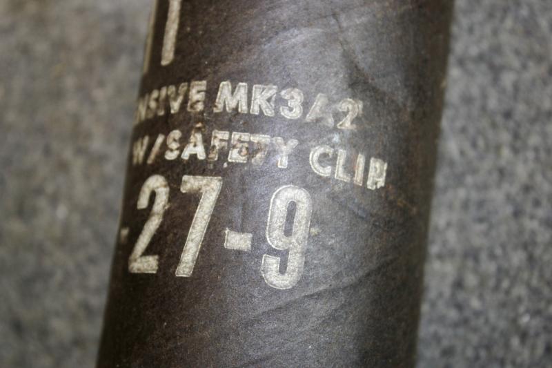 This is a inert MK3A2 offensive grenade, which was first introduce in 1918 and continued to be used to the mid 1970's. There where three types of MK3 grenades. MK3 ( WW1 ), MK3A2 ( WW2 & Korea ) and the MK3A2 for Vietnam. Pre-1945 examples would have a Roman numeral designation ( MKIII), where post-war are numbered . This example has a May 1971 dated body with a February dated fuse. The container is dated May 1974. U.K. Sales Only.