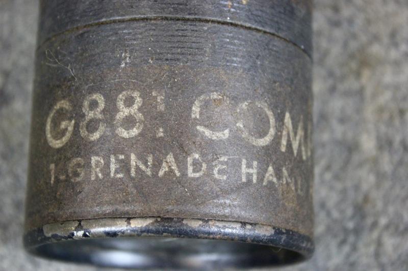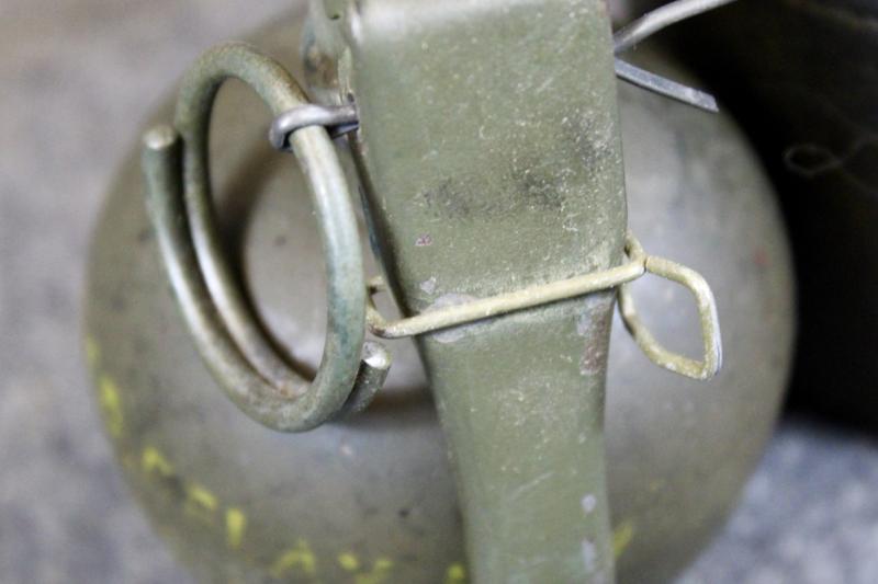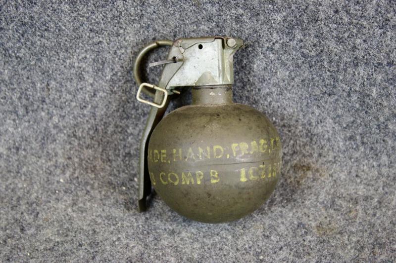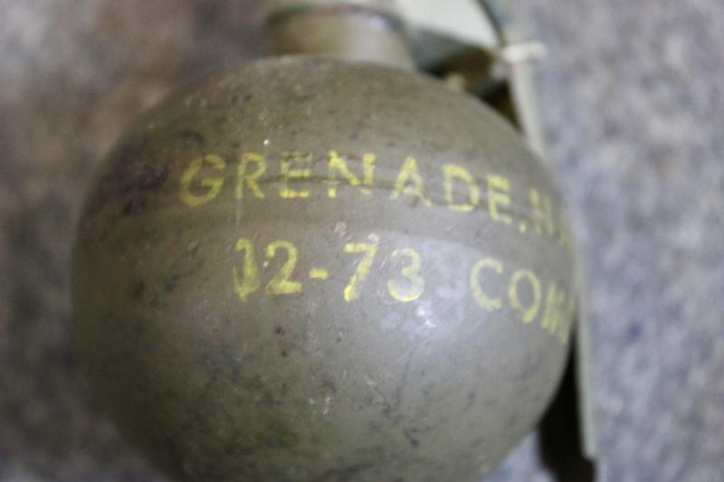 The M67 grenade was first introduced in 1968 and is more commonly known as the 'Baseball grenade" due to its shape. This example is in excellent condition with the body dated December 1973, the fuse is dated February 1973 and the container dated September 1973. The grenade still retains its safety clip. U.K. Sales Only.