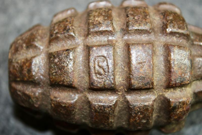 This is a pre-1942 made MKIIA1 fragmentation grenade, more commonly known as the "Pineapple Grenade" due to its resemblance to the said fruit. Early manufactured MKIIA1 grenades where paint yellow to mid 1942, with all grenades manufactured after 1942 where painted olive drab. However the majority of early grenades where overpainted leaving a yellow band at the top of the grenades body. This example has traces of its original yellow and post-1942 over paint finish. It is maker marked "S" for Stewart-Warner Speedometer Company. U.K. Sales Only