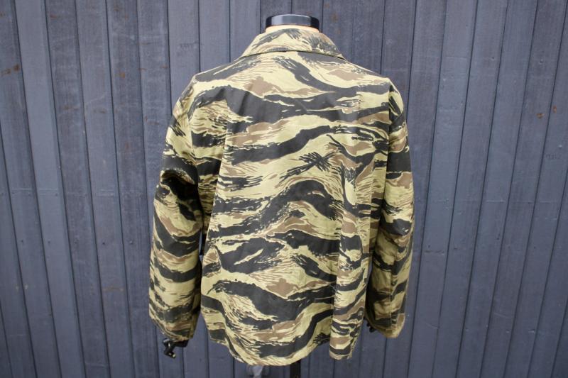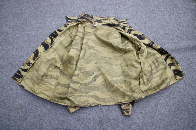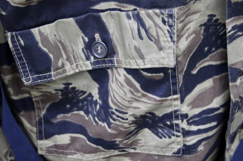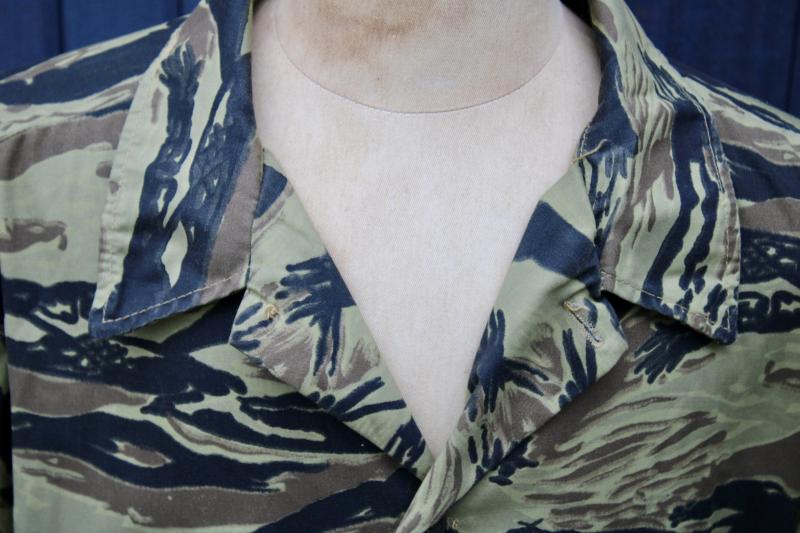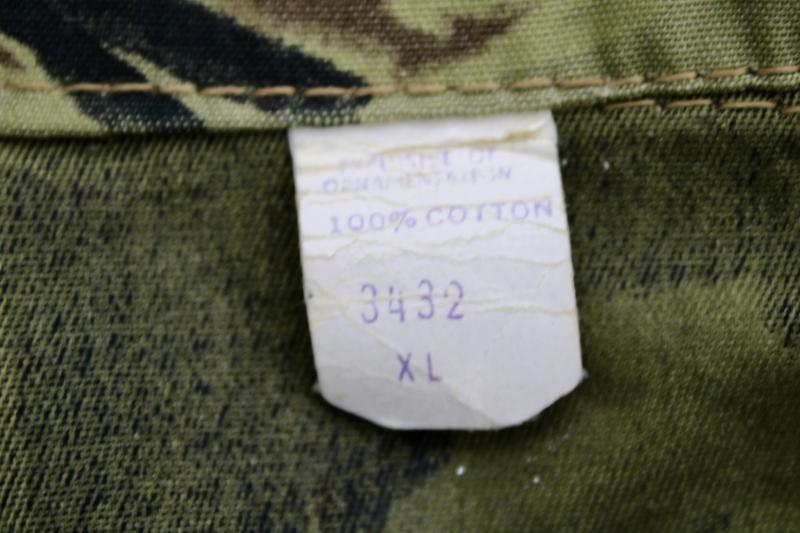 This is a tiger stripe shirt which was worn by U.S. military advisors and special forces. This example is in unissued condition retaining its original paper label which gives the size XL.