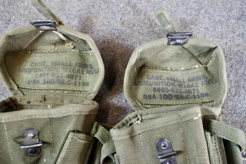 A set of rare M1956 short magazine pouches for the M16 assault rifle. Each pouch could hold two 20 round magazies. Both pouches are dated 1968. ( 68C ) and are DSA ( Defence Supply Agency ) marked.