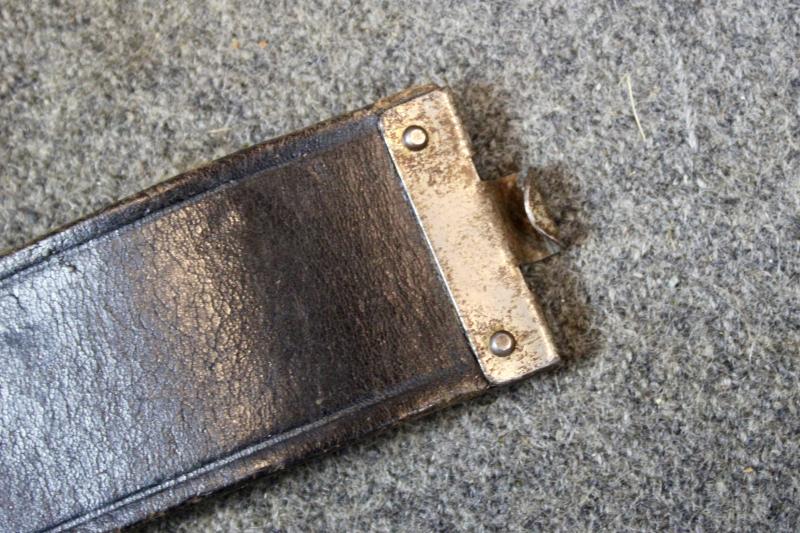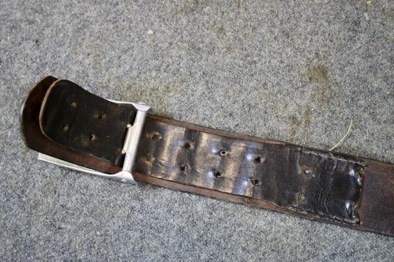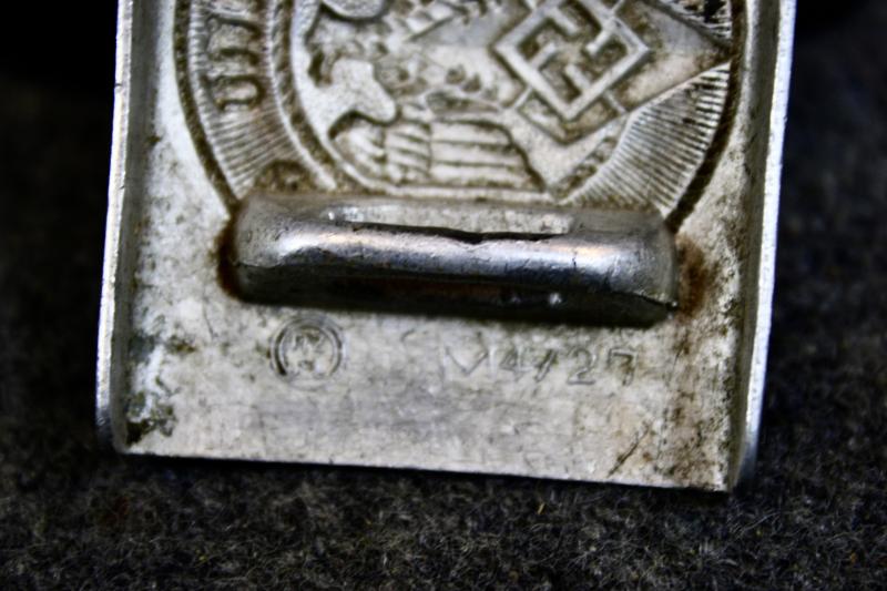 A aluminium Hitler Youth buckle, which comes with its leather belt. The buckle is maker marked M4/27 for Overhoff & Cie. The belt leather measures 33 inches.