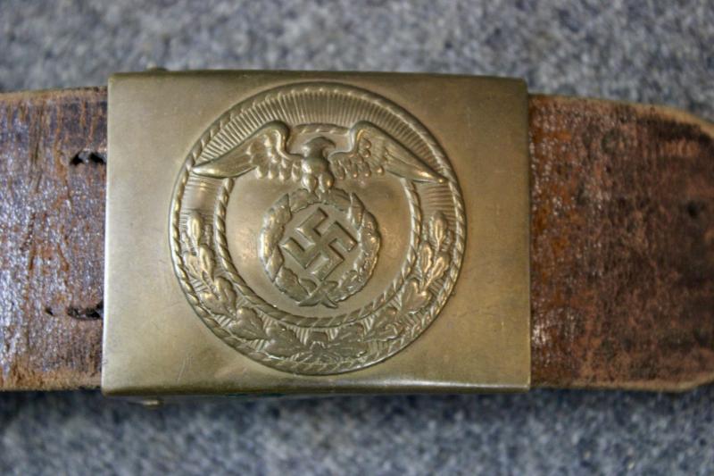 This is a good example of a 2nd pattern SA ( Sturm-abteilung ) brass buckle which was introduced in 1935. This example comes with a brown leather belt approximately measures 35 inches.