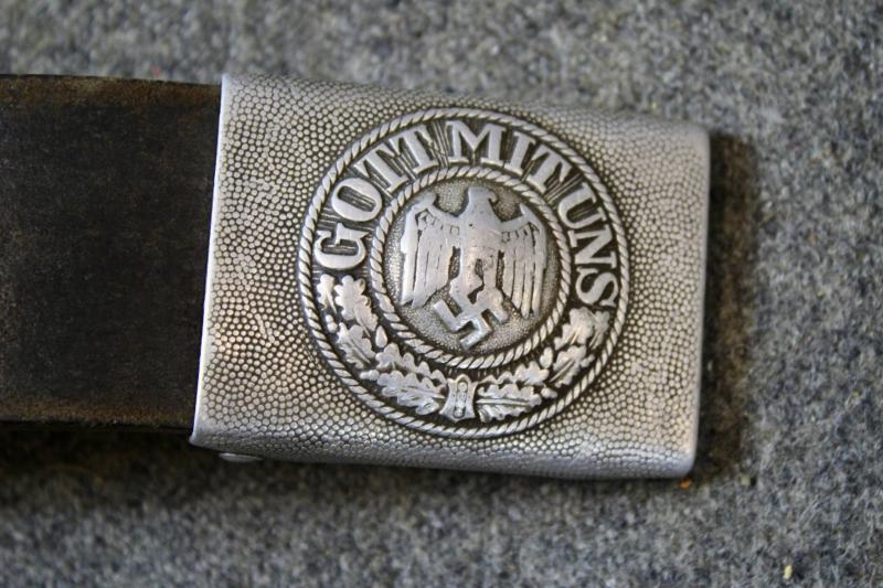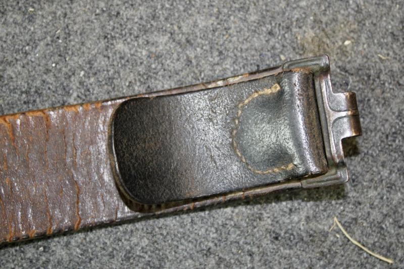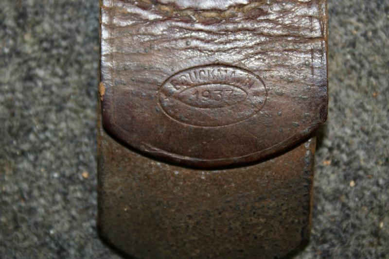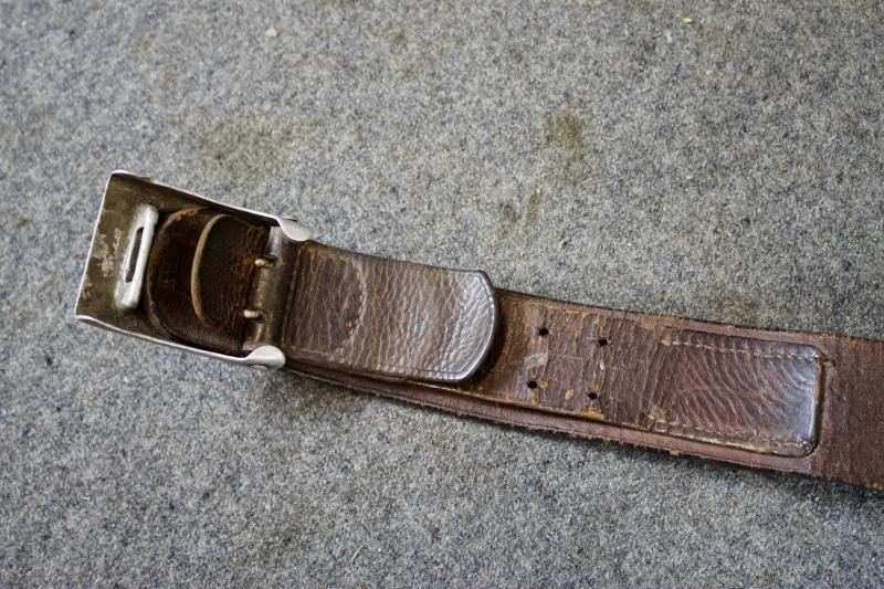 This army aluminium buckle which comes with its leather belt. The buckle's leather tab is dated 1937 and is maker marked. The leather belt is in very good condition and is size stamped 85.