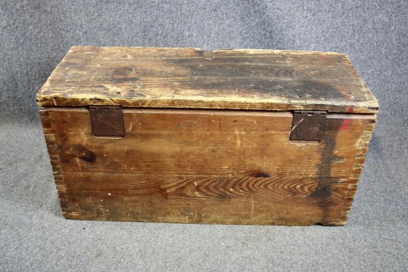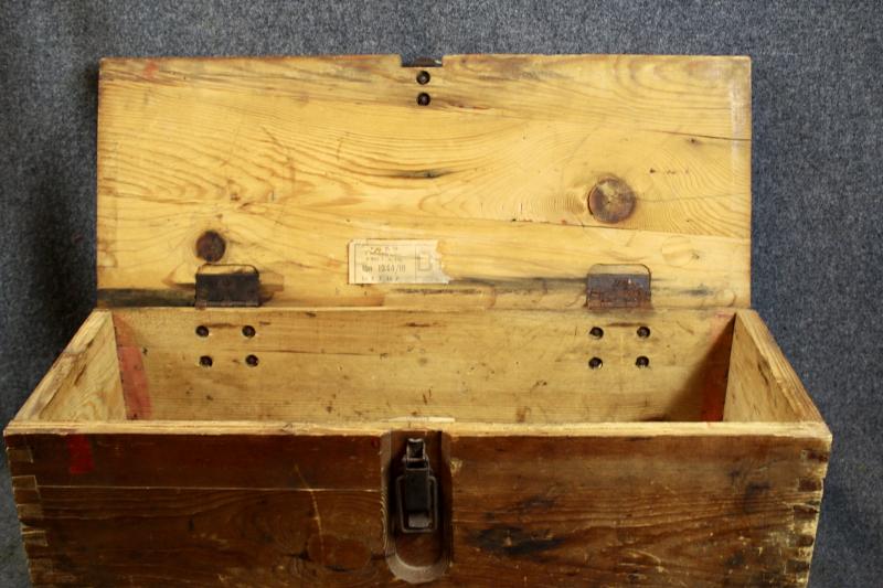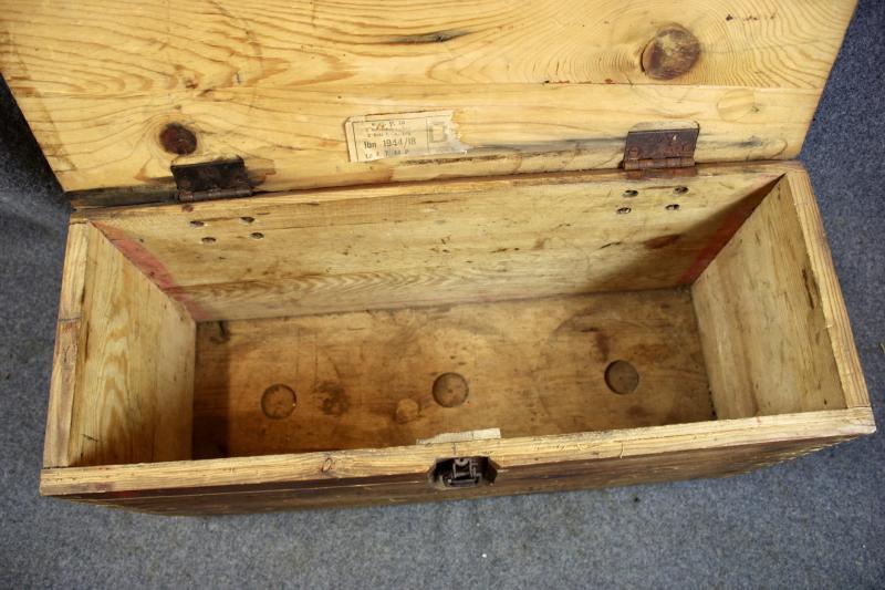 This is a wooden munition box which is stamped "HEERES MUNITIONS" ( Army Munitions ). for the S.FH.18 field Howitzer This example retains its paper label which is dated 1944.