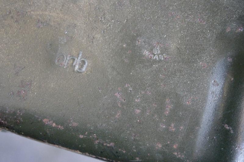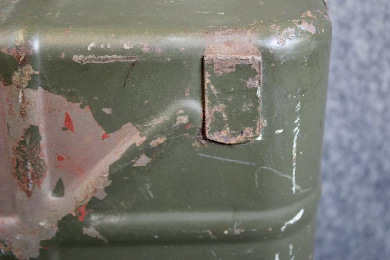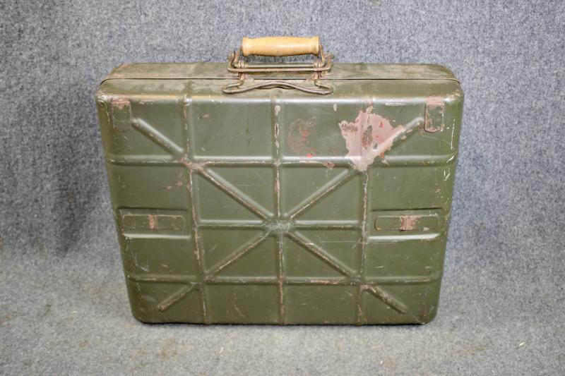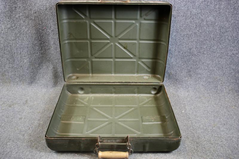 This is a M1924 stick grenade box, which has been repainted. However the colour is a perfect match to the original colour. This example is missing its strap retaining loops, There is a visible three letter makers code "brb" for Richard Rinker GmbH. It is also stamped with a Third Reich proof markings ( Waffenampt ).