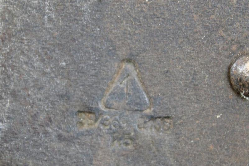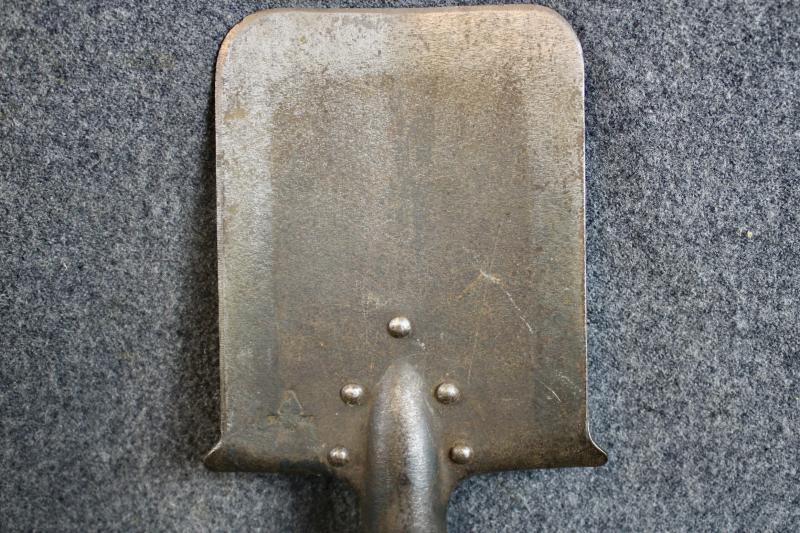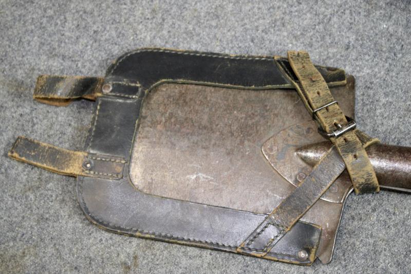 An early type straight entrenching tool which is maker marked and comes with the leather carrier with two belt loops. The end of the securing strap has been cut but still secures the entrenching tool to the carrier.