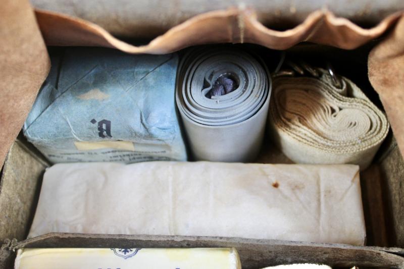 A German medical pouch with contents. This is the type of pouch which would have been used by the German Red Cross. It contains various period medical items, such as scissors, bandages, tourniquets and other medical supplies. The pouch is in very good condition and retains its shoulder strap