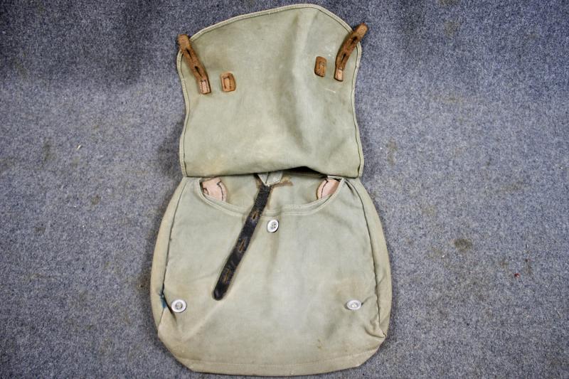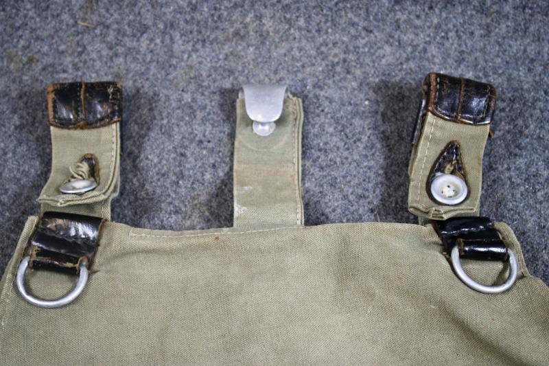 This is a mid-war made M31 bread bag with leather re-enforcements and a split compartment. This example is in very good condition.