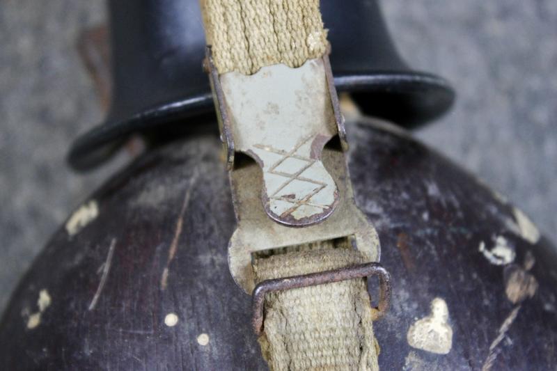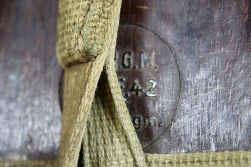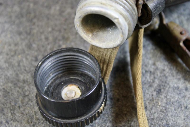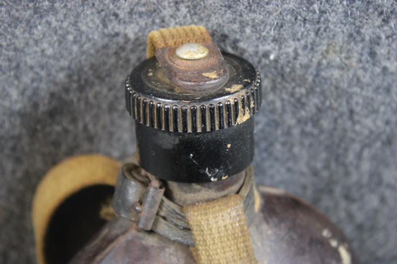 This is a 1942 dated tropical issue water bottle, which has specks of white paint. The carrying harness has suffered with some damage. The bread bag clip has come away, however this has been stitched back. The bakelite cup has a piece missing from its outer edge. Still ideal for display.