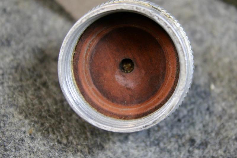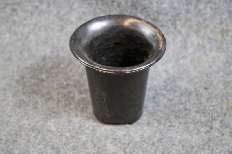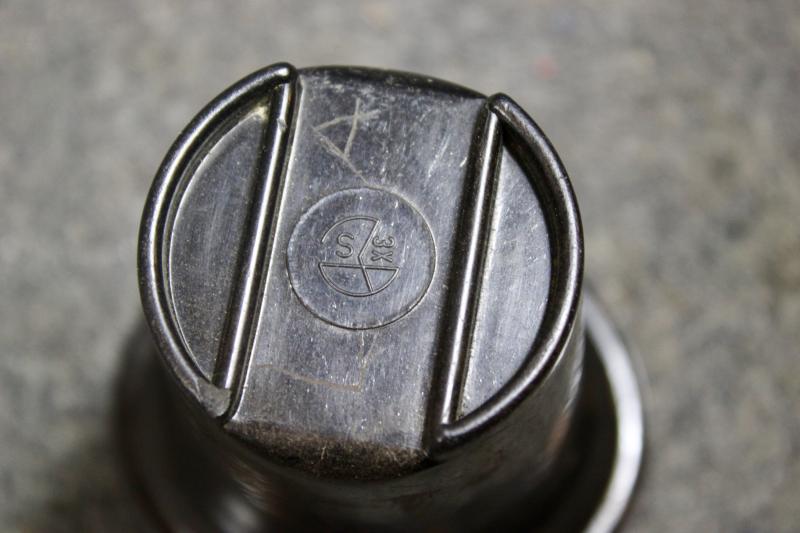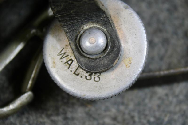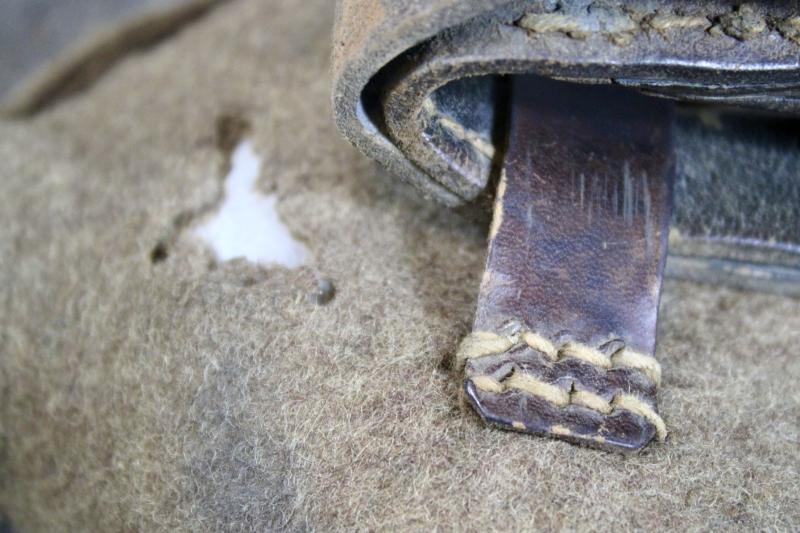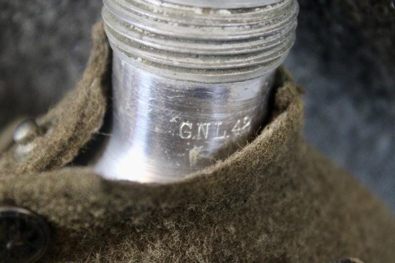 This is a M31 water bottle which is dated 1942 maker marked GNL and has a 1933 dated cap, which retains its rubber seal and is maker marked WAL. This example comes with a black bakelite cup. The felt cover has a moth hole just by the leather harness loop.