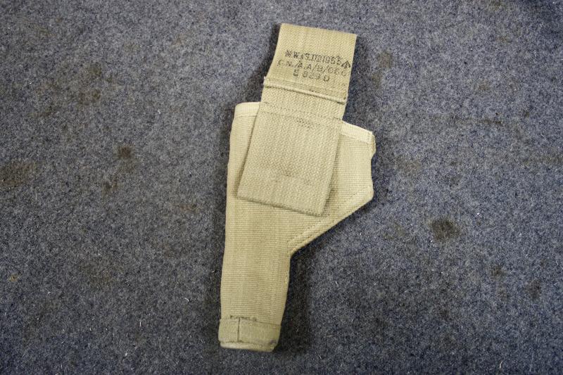 This is a 1955 dated tankers holster issued to armoured fighting vehicle crews. It is identical to the pattern issued during WW2. The only difference is the year of manufacture. This example is maker marked 'MW&S.LTD" for Martin Wright & Son and comes with its cleaning rod.