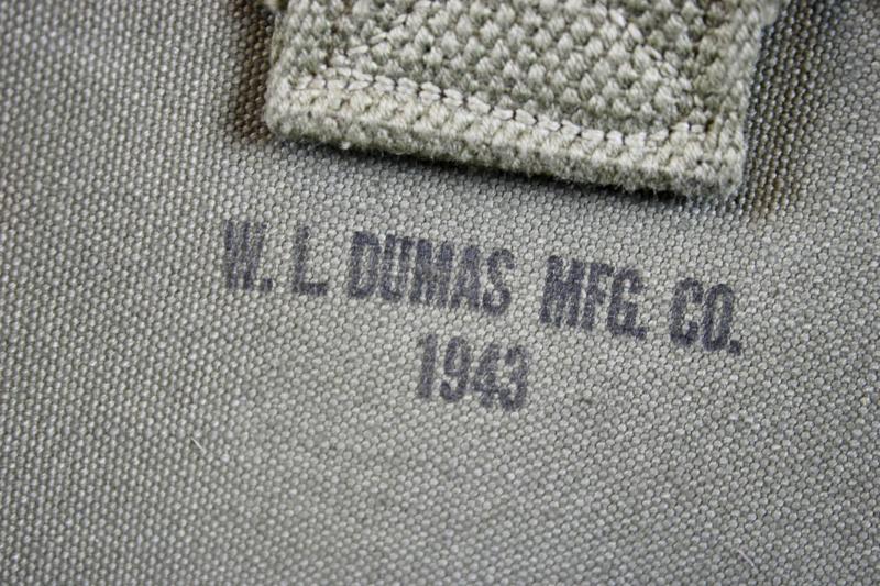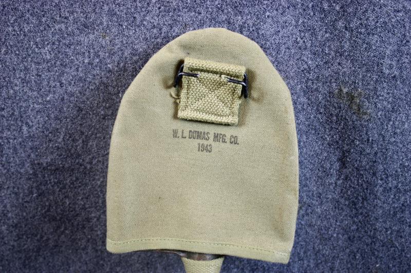 This is a M1910 intrenching tool which comes with a mint example of a M1928 carrier, which is maker marked W.L.DUMAS MFG.Co and dated 1943