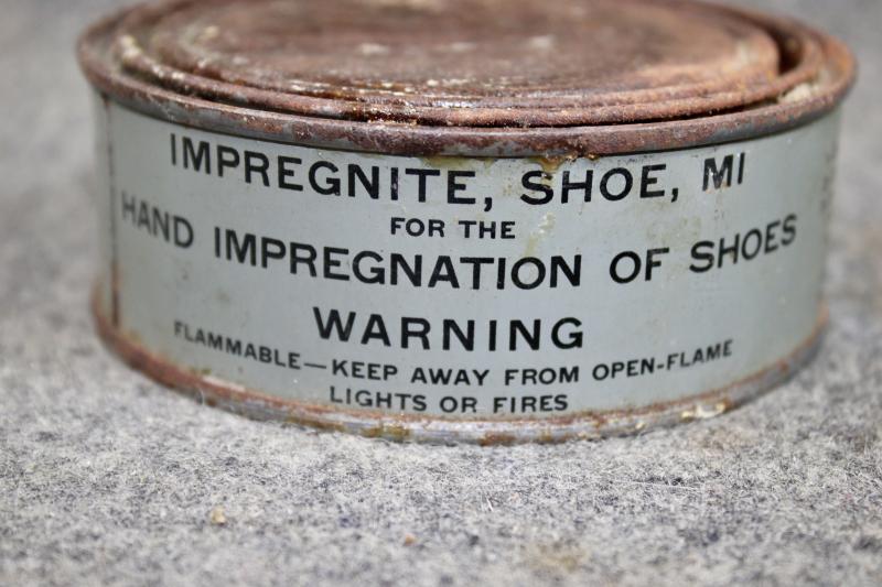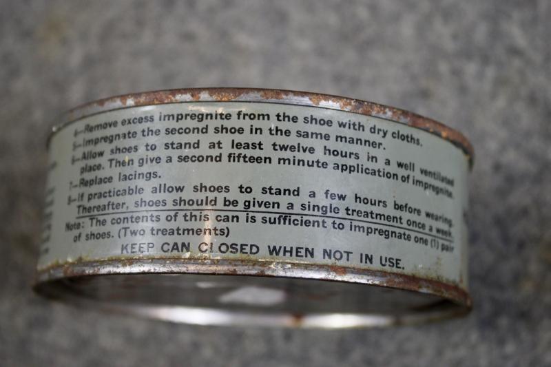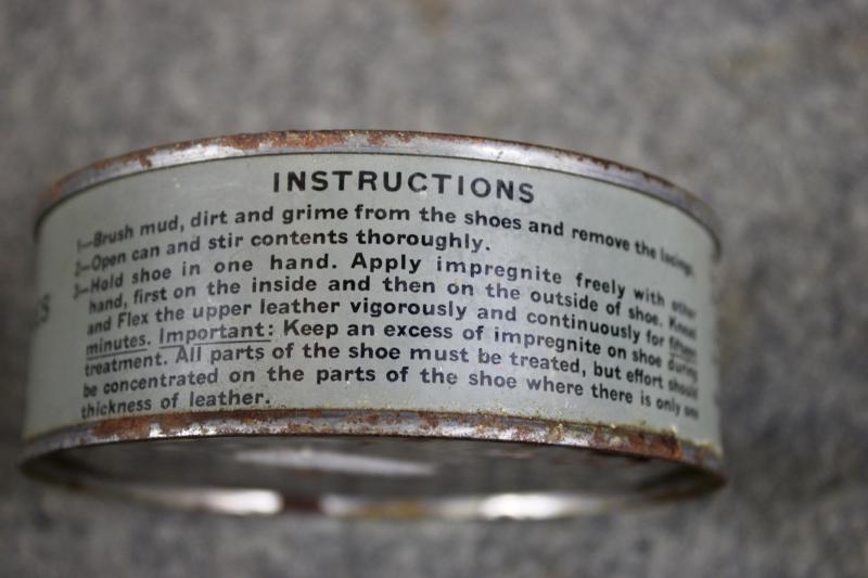 This is a sealed tin of Impregnite M1 shoe protector which consists of a solvent, oil, waxy paste which makes the boot or shoe waterproof.