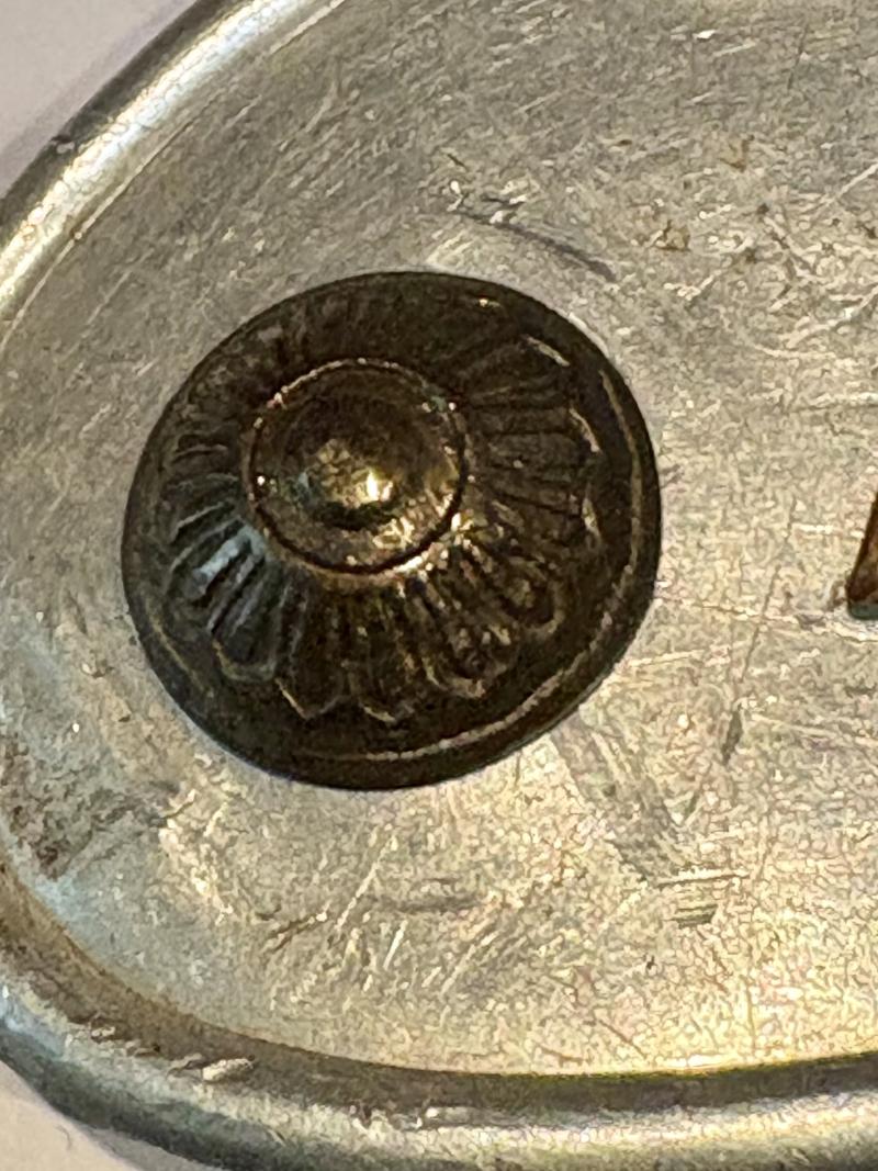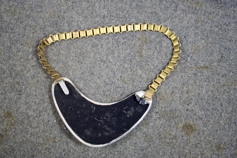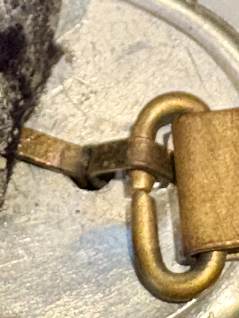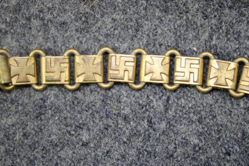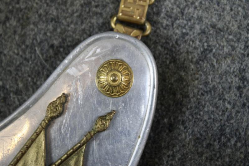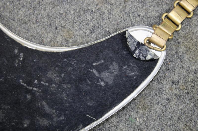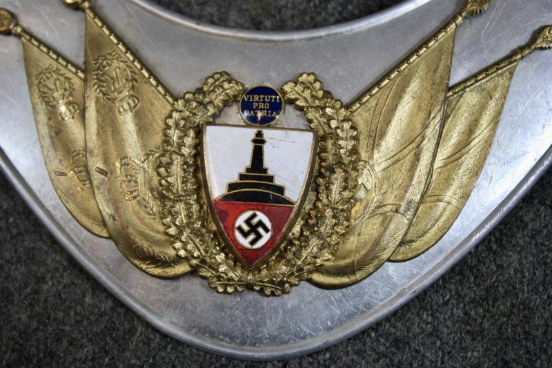 This is a type 1 Standard bearers gorget which would have been worn by a member of the Deutscher Reichkriegerbund ( German National Veteran League ). This example has had a minor repair to the right stud which connects the brass chain where the fitting appears to have broke off. Besides the repair it is in good condition and has the makers code 1 for Deschler & Sohn.