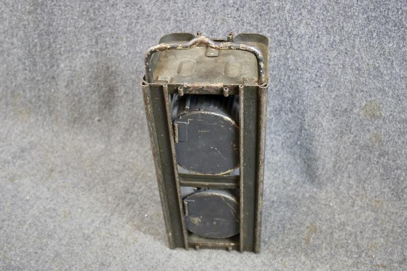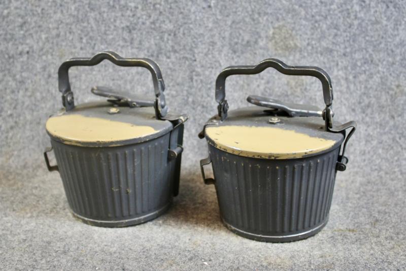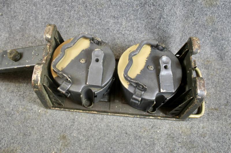 Two MG42/34 fifty round assault drum magazines with their carriyng rack. The drum magazines where originally paint ordnance tan and have been overpainted in steel grey. One of the magazines is marked with the three letter makers code "ddf" for Lohmann-Werke AG. The other drum magazine has no makers mark and may be a Yugoslavian post-war made copy. The rack is in very good condition and has also been period over painted with traces of the original ordnance tan visible. It is also maker marked with the manufacturers two letter code "wa" for Hugo Schneider AG and dated 1943.