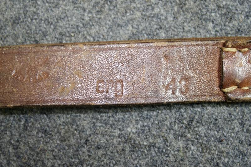 A very good example of a 1943 dated MG42 sling which is maker marked "erg" for A.Doppert, Treibriemenfabrik. Unfortunately the sling has a tare by the pistol grip release catch.