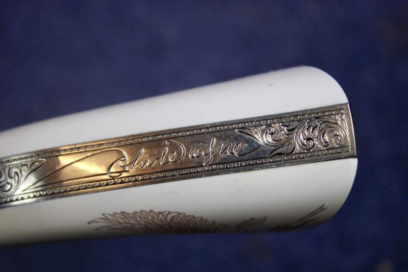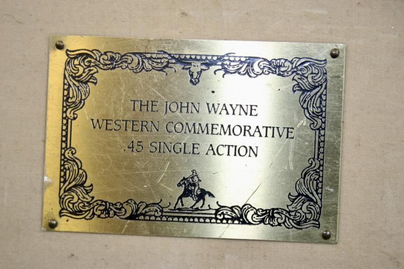 This is an exact replica of the M1871 single action revolver produced by Colt for John Wayne to commemorate his contribution to the Western films. It is exact in every detail. The body is nickel plated and extensively engraved with gold plating and bears the same serial number of the real revolver "151284. John Wayne's signature is engraved on the grip strap. The grips have a slight stained appearance which was actually soaked by John Wayne himself on the real revolver to create a stained look. The barrel also has an engraving of a stage coach which was the name of the film which propelled John Wayne to Hollywood stardom. The cylinder will not load any rounds, however it does have a full working action. It was first made available in to buy in 1992 for $450 ( £260 ) with a later version produced in 2007. However the later version does not have John Wayne's signature on the back of the grip strap, or the wall hanger. Sold subject to the Violent Crimes Reduction Bill. U.K. Sales Only