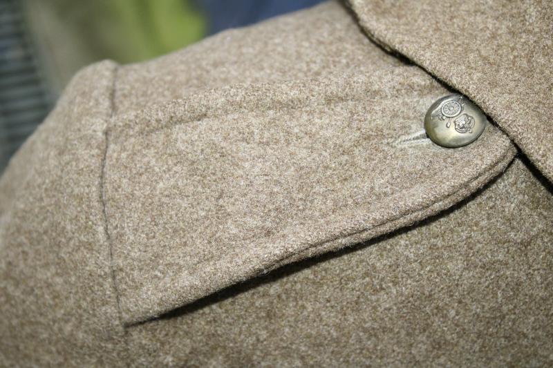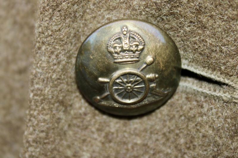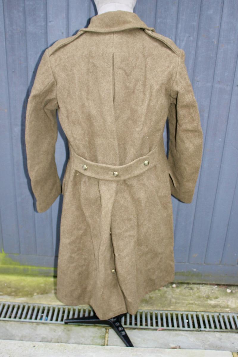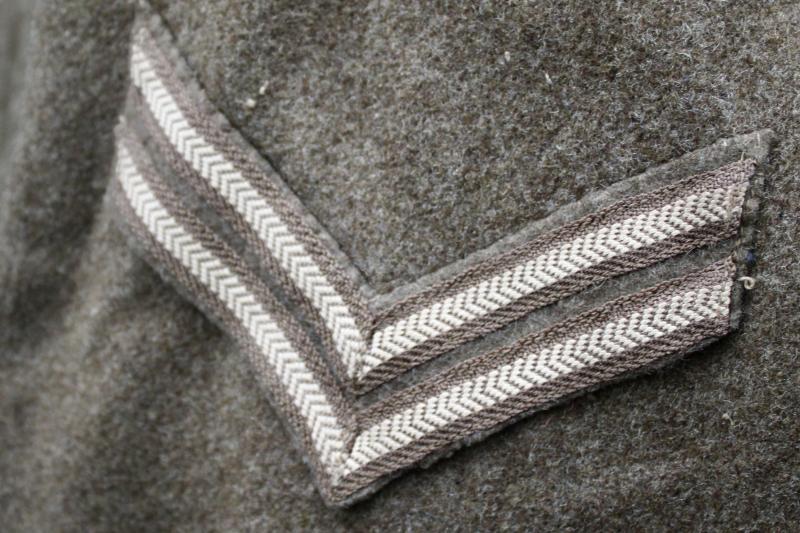 This is a 1941 pattern great coat, which differs from the 39 pattern great coat, buy the addition of a invert pleat to the back and the length of the coat was decreased by 2 inches and the fall of the collar by 3/4 inch. This example is in very good condition. However it has suffered what looks like coffee stains to the pocket lining. The coat has brass buttons of the Royal Artillery and the rank of corporal. The coat also retains contract label, which gives the manufacturers name Soloman, Goldstein, the size, which is size 5 and the date of manufacture 17th March 1944.