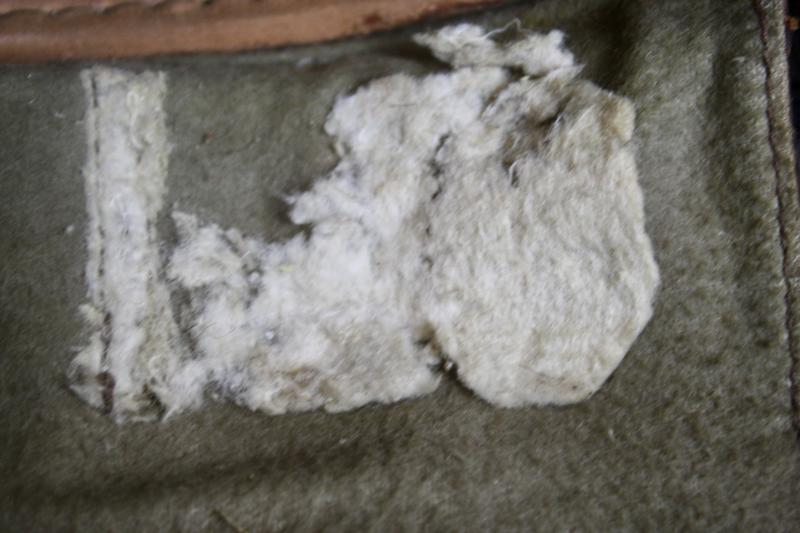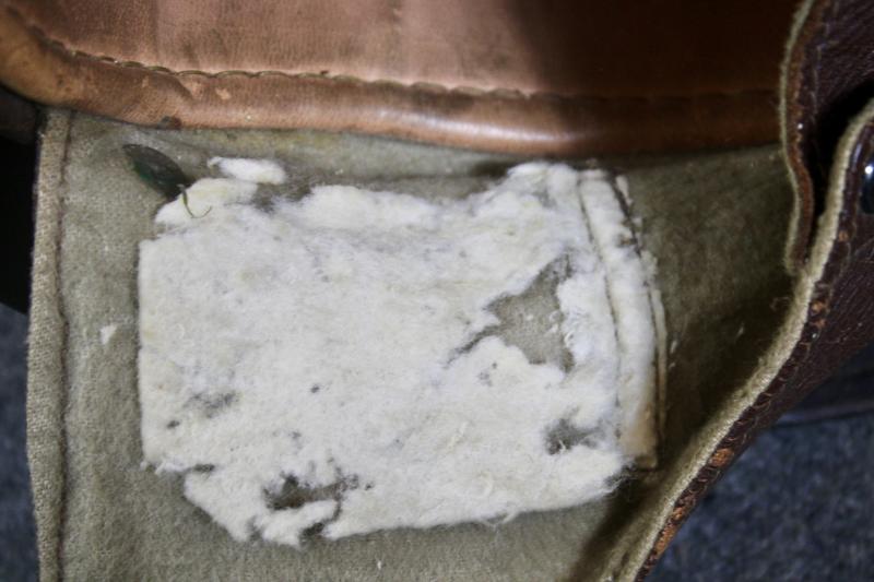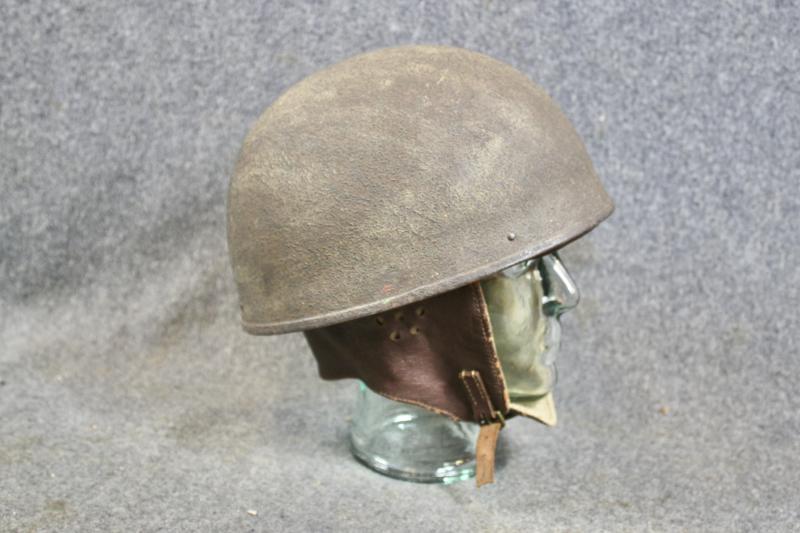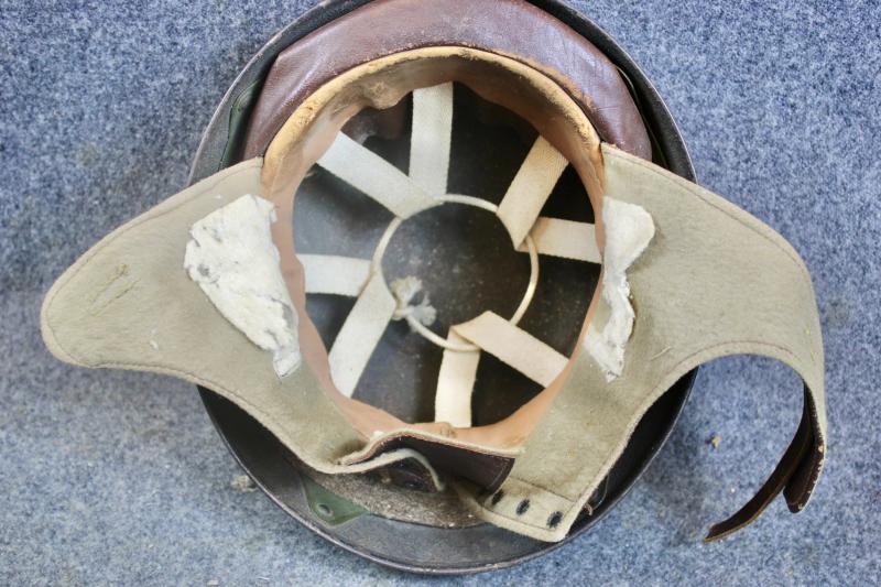 This is a 1944 dated despatch riders helmet, retaining most of its original finish. The liner is in good condition however the chinstrap has been cut to a shorter length and the the lace is missing from the back to either reduce the enlarge the liners fit. The liner is also maker marked "BMB" for Briggs Motor Bodies and is size stamped 6.1/2. However the internal ear flaps have worn away.