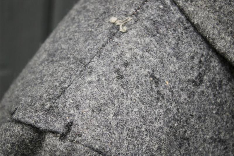 This is an enlisted man's great coat, which has externally suffered with moth tracking and minor moth holes. The lining is stamped with the usual size stamping is is maker marked "Wilhelm Schwar". One epaulette button is missing, however there is spare button in the pocket.