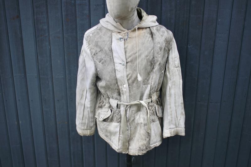 This is mouse grey reversible parka which was the first pattern parka worn both by the army and the Waffen-SS and was introduced in the winter of 1942/43 as a result of the bitter experiences of the previous winter of 1941/2. When thousands of German troops fighting on the Eastern Front suffered from the extremely cold temperatures. This example has had a number of period repairs. The mouse grey colour has faded. It retains it's internal waist belt and hood drawstring. The button flap is stamped with the makers name and place of manufacturer "Stettin" ( Szczein ) which is now in modern Poland.