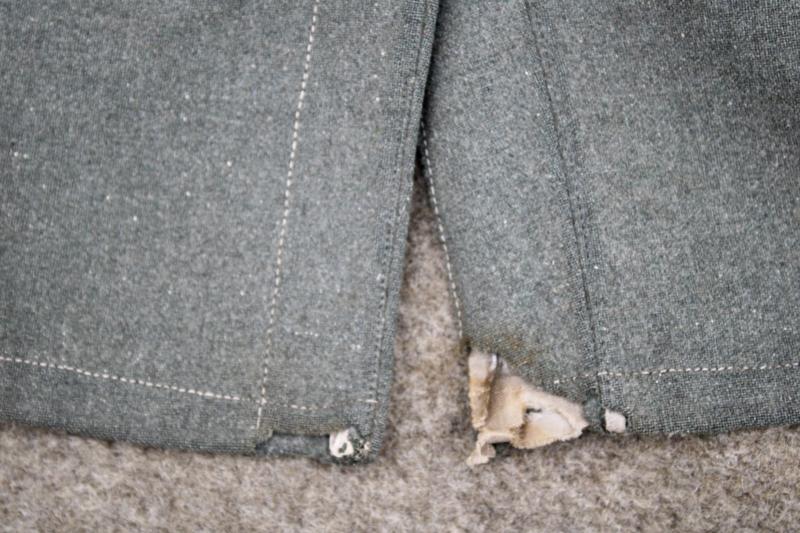 A M40 tunic which has suffered with some minor damage to the bottom of the rear of the tunic and some fraying to the two lower button holes. Otherwise the tunic is in good condition. The collar tabs and breast eagle have been re-applied and the tunic comes with a set of epaulettes which have the branch of service piping white for infantry. The lining has visible size markings. Still ideal for display and damage is not visible when a full set of field equipment is worn.