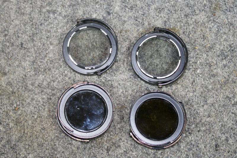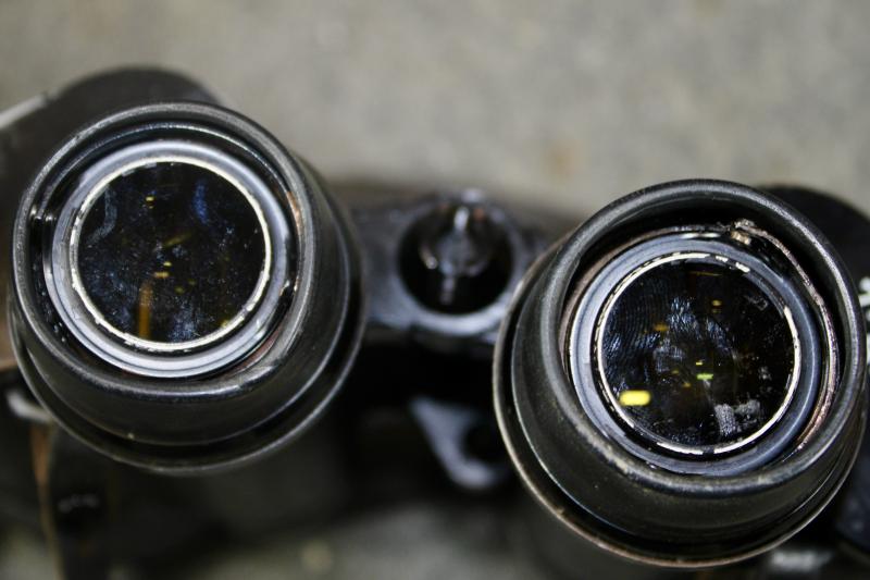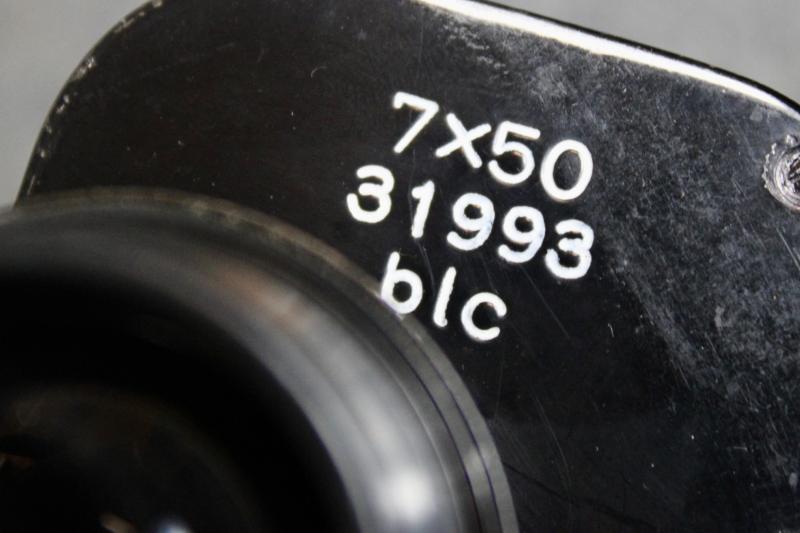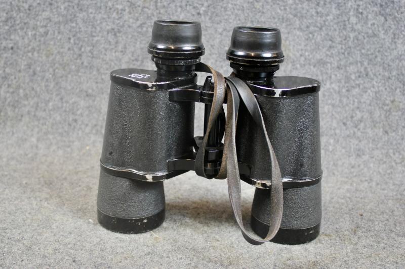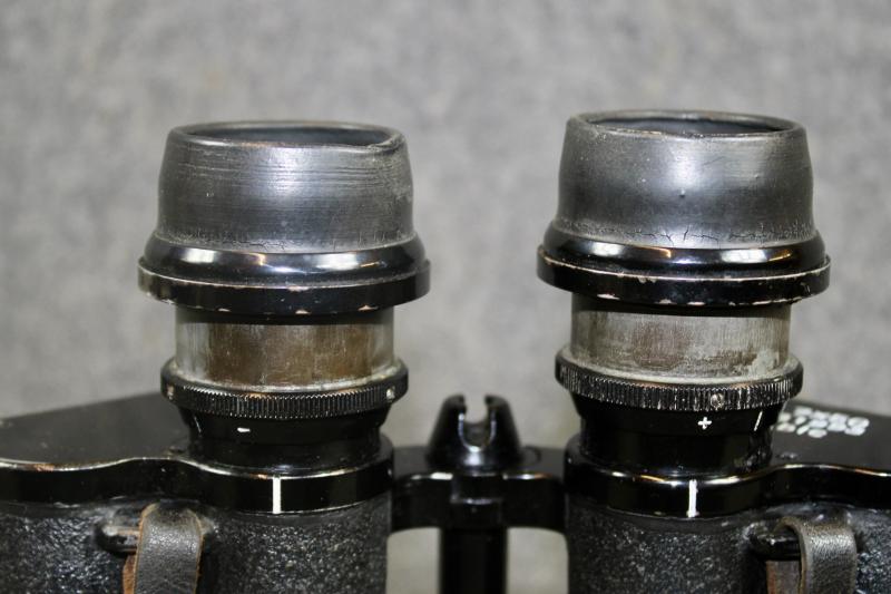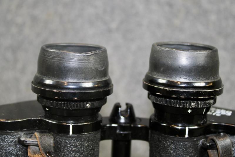 An extremely rare example of 7x50 gas mask binoculars which had two special extendable rubber eye-pieces which allowed the user, to use the binoculars while wearing a gas mask. When the eye-pieces where in its normal position, the binoculars can be used as a standard pair of binoculars. The gas-mask binoculars would come with two sets of coloured eye lenses filters. This example is in extremely nice condition with the rubber eye pieces still soft and supple. The optics are crystal clear with visible graticules. This example is marked with the three letter maker's code "blc" for Carl Ziess and come with their carrying case which is also marked "blc" for Carl Zeiss" The carrying case for Gas mask binoculars differ from the standard carrying case as they also carried two sets of coloured eye piece filters, which this example still retains. The case also has a nice clear Third Reich era proof marking ( Waffenampt ).