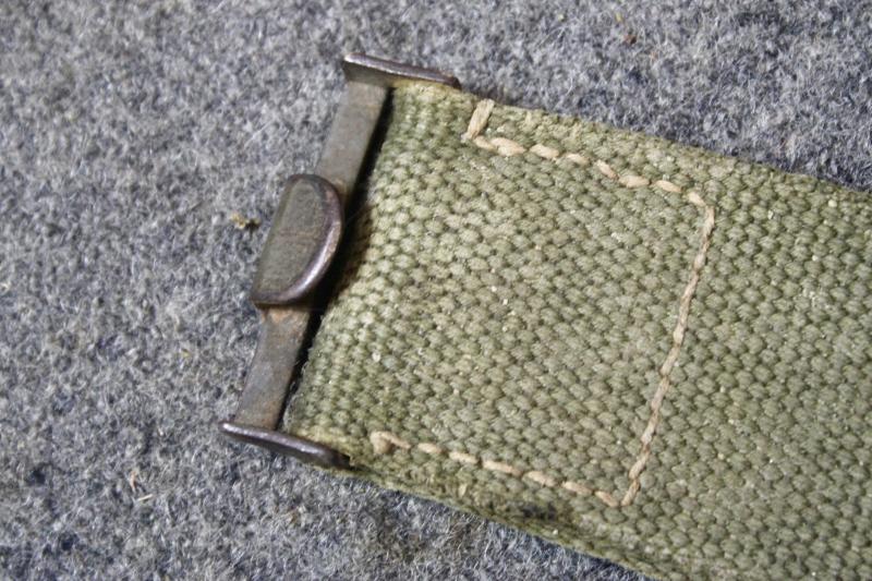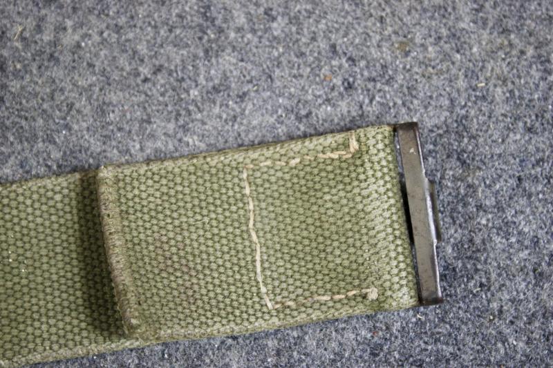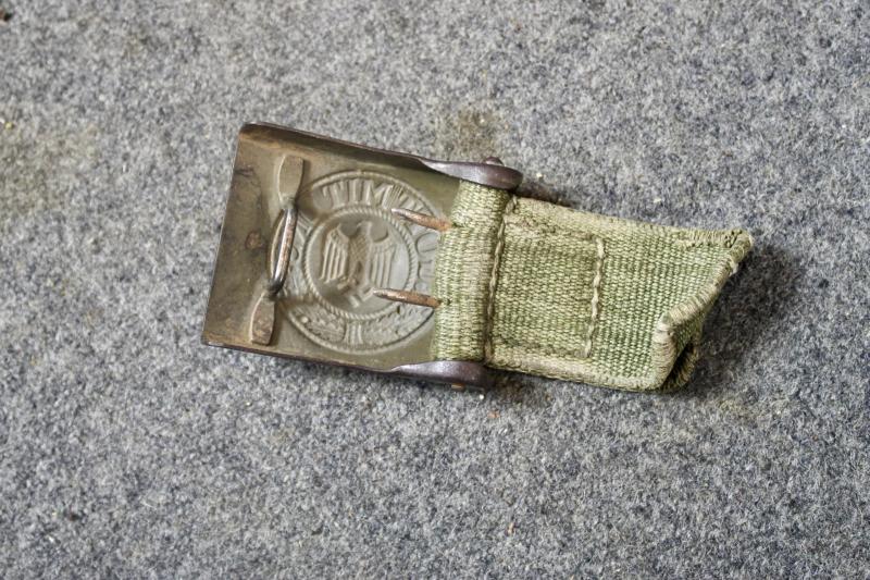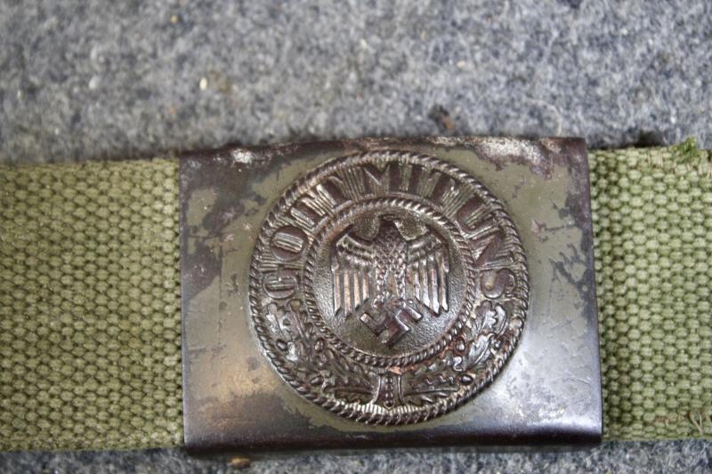 This is an olive coloured webbing belt and steel buckle with the same colour webbing tab associated with the Afrika Korps which initially first wore olive coloured webbing. This example is in in good condition.