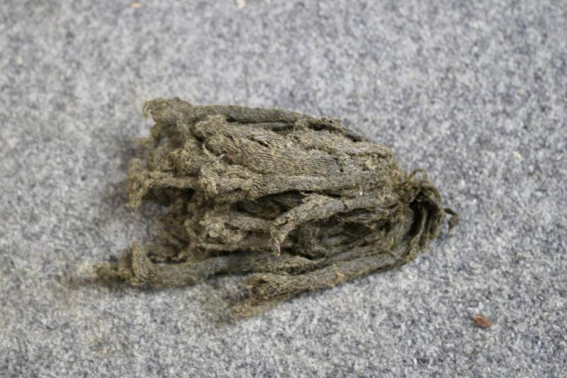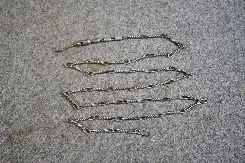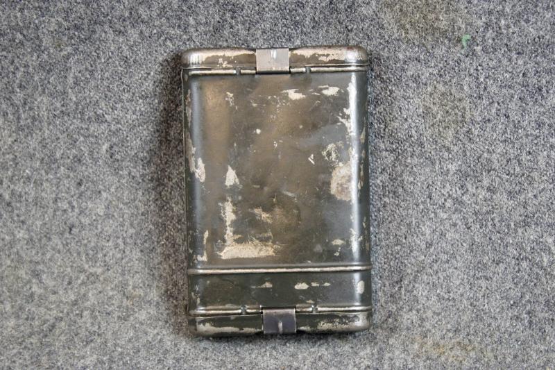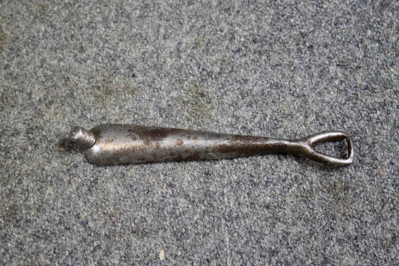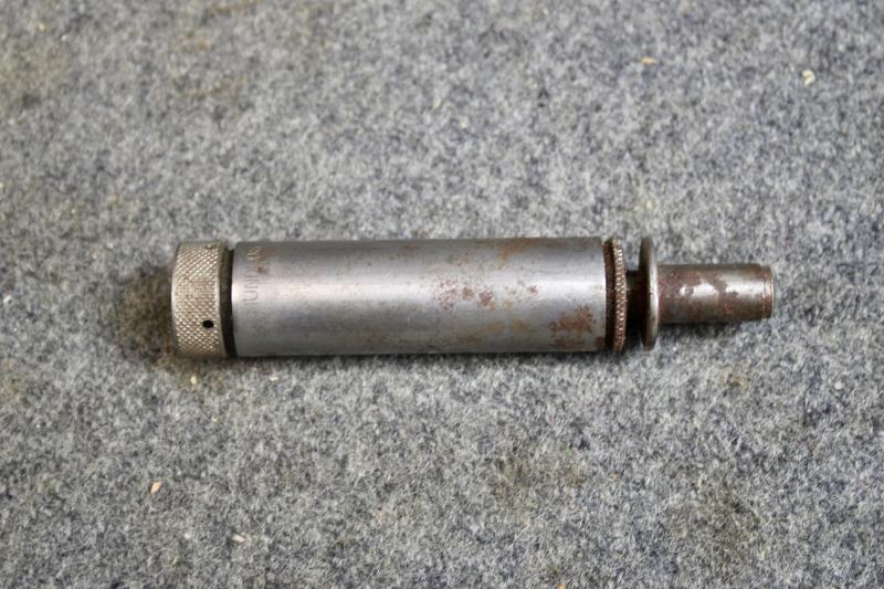This is a complete K98 cleaning kit, which contains two brushes a chained linked metal pull-through, spoon and a 1940 dated oil bottle which is maker marked Mundlos. The container is painted in Luftwaffe blue.