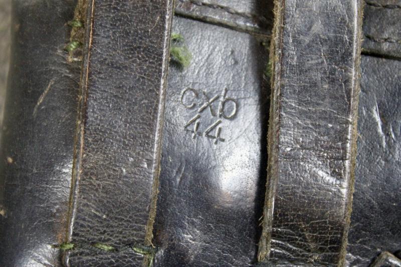 This is a very good example of a 1944 dated soft-shell holster for the P38 pistol. This example is maker marked "cxb" which identifies the maker as Moll Lederwarenfabrik.