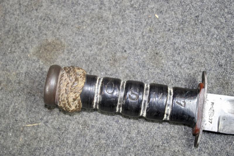 This is an extremely nice example of an RH-37 Fighting/Utility knife, which is very similar in design and function of the Ka-Bar. However the RH-37 was only issued to the Navy and where produced by Pal. The ricasso is also stamped 'Navy". They also have a red spacer on the pommel. However this example's red spacer is covered with wrapped string to give a better grip. The handle has also been personalised with the letters 'C.S.M" for Command Senior Chief Petty Officer with the number 7. This example also comes with a U.S. Navy MKII scabbard. This is an age restricted item. Proof of age must be provided. A photograph of your Drivers Licence or Passport is required before the item is sent. U.K. Sales Only.