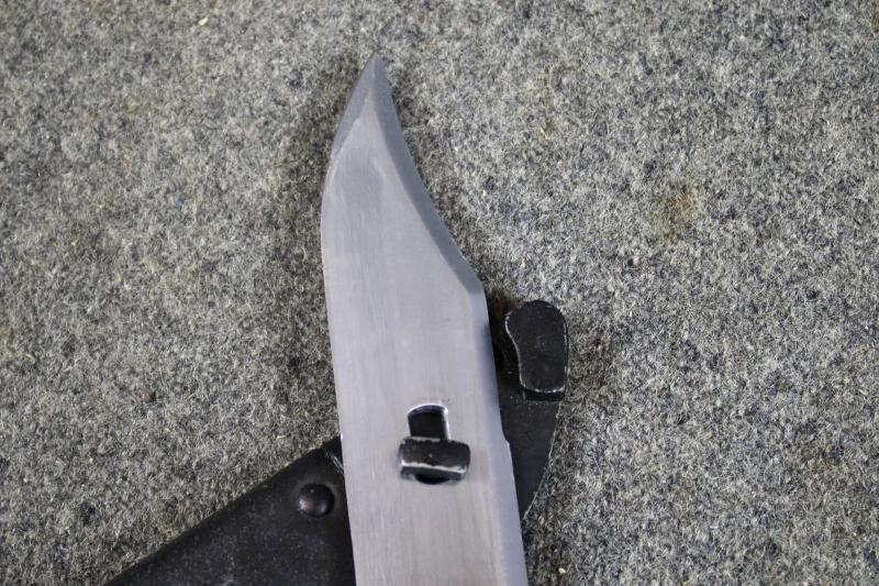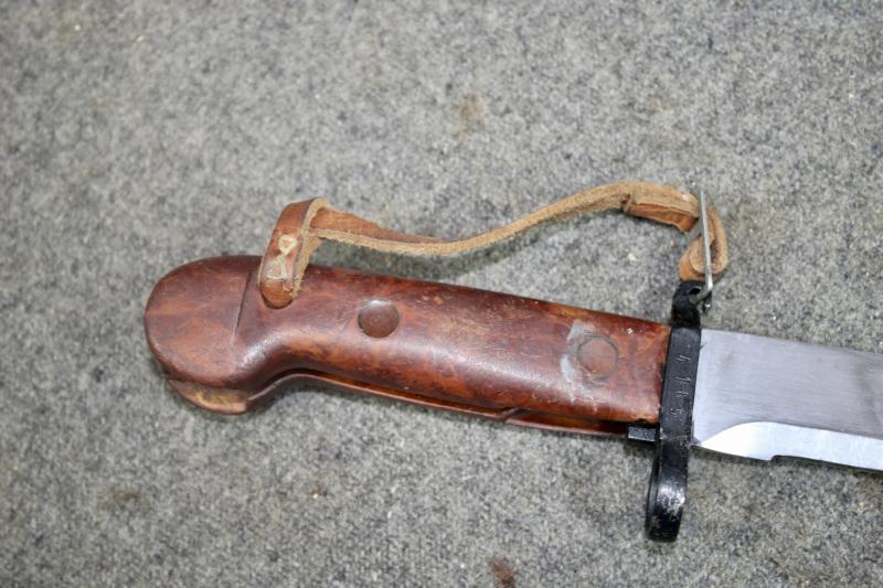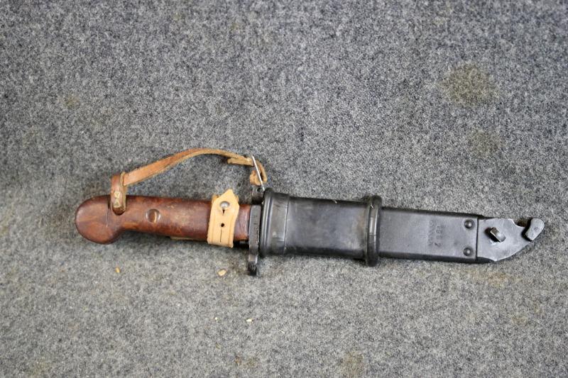 A Romanian made AKM bayonet with red grips. This is an age restricted item. Proof of age must be provided. A photograph of your Drivers Licence or Passport is required before the item is sent. U.K. Sales Only.