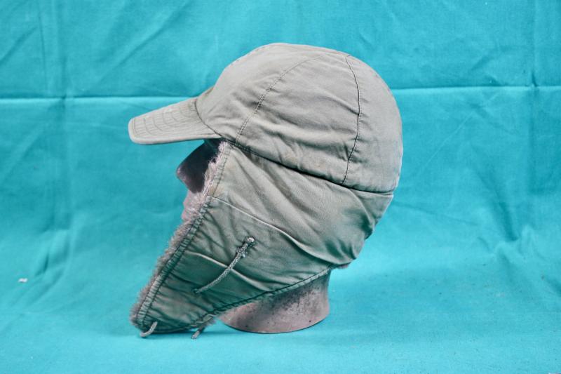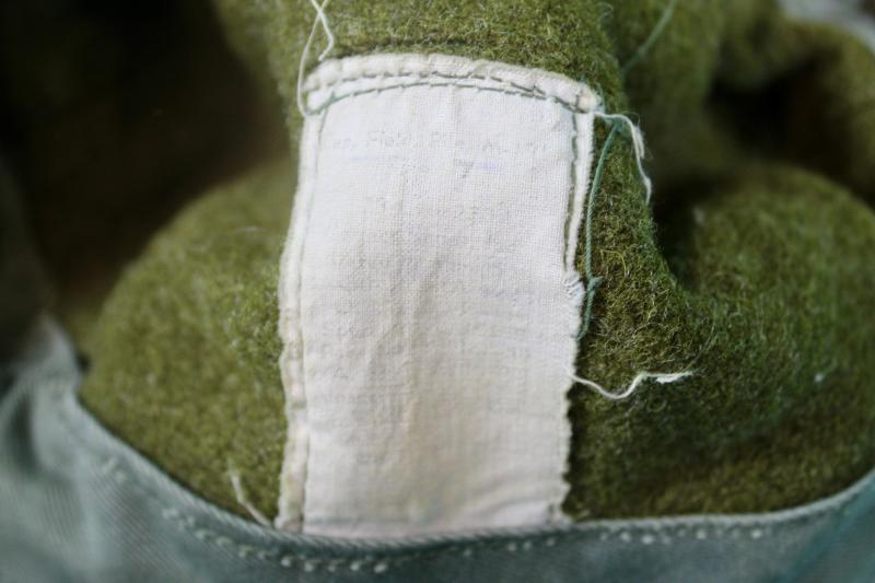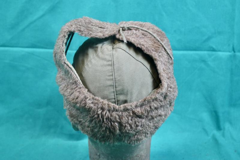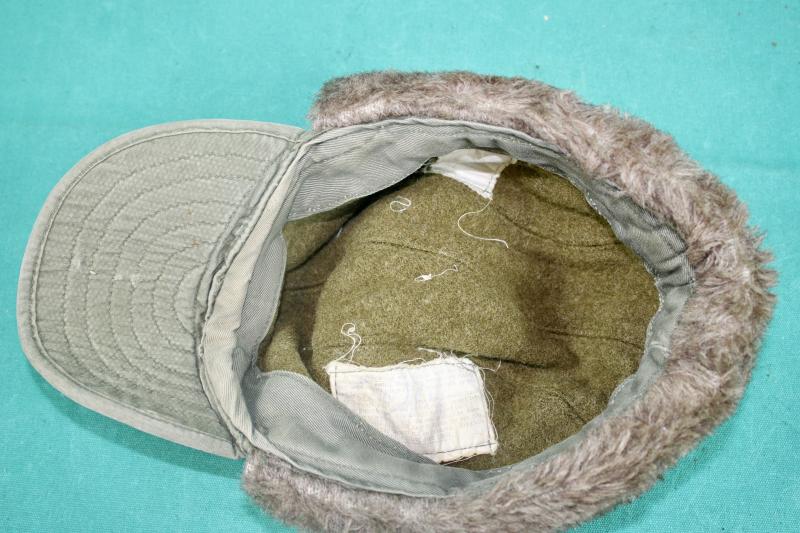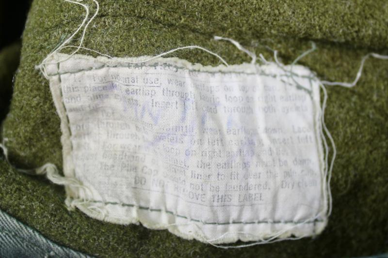 This is a pile lined winter field cap, which was an extremely popular item in the winter of 1944/45 and was highly sort after by vehicle drivers. This example is in good condition retaining it's instruction and contract labels. The details on both are faint and partially visible and is size stamped 7.