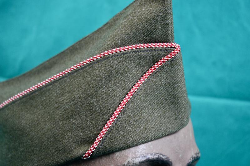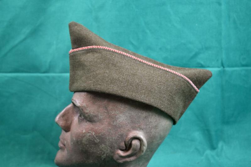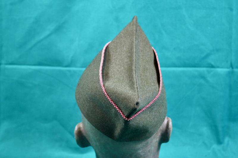 A army garrison cap which has the branch of service piping red and white for the Corps of Engineers. This example is unissued and retains its label, which gives the size 7.1/8 and the makers name L.G.Cap.