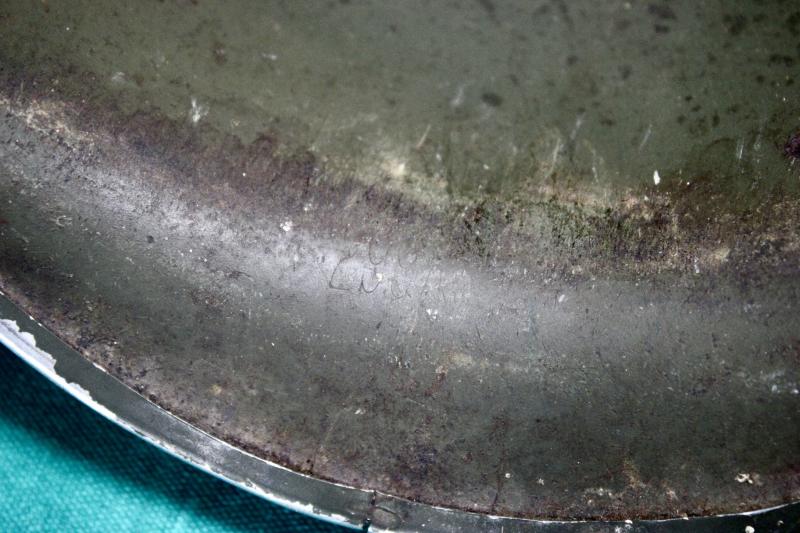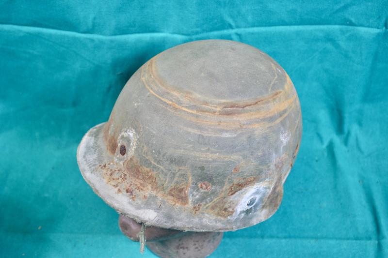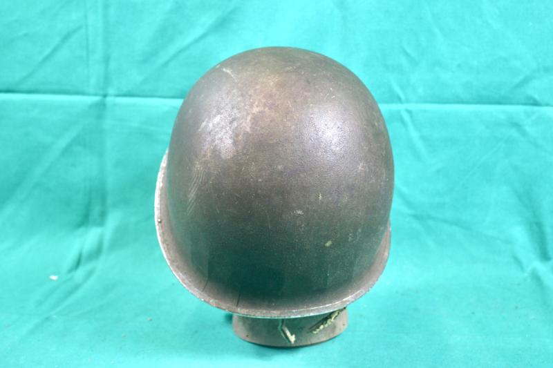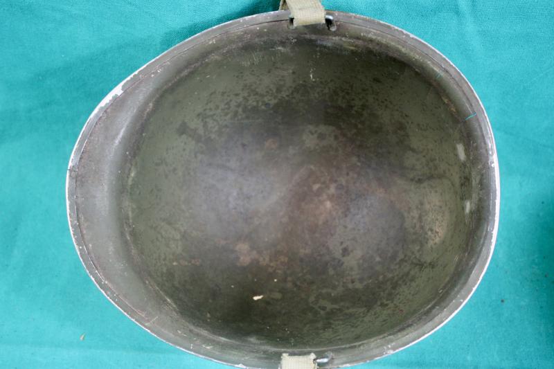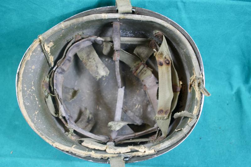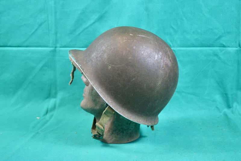A nice example of a a M1 fixed bale helmet, which would have been produced between July 1941 to October 1943. This example retains its original finish, webbing chinstrap with early blackened brass buckle with raised features. The helmet comes with the early 1st pattern liner more commonly known as the Hawley liner. The outer edges has suffered with some fraying and the suspension straps have torn but are present including the liner's chinstrap which the leather has dried. The primary manufacturers of the first pattern liners was the McCord Radiator and Manufacturing Company, who subcontracted the production of the liners to the Hawley Products Company which lend to the nick name of the liners to Hawley liners. The inside of the shell has a visible heat number.