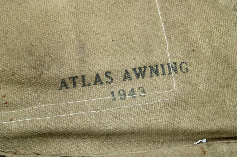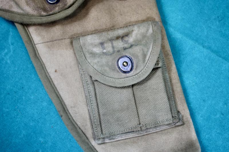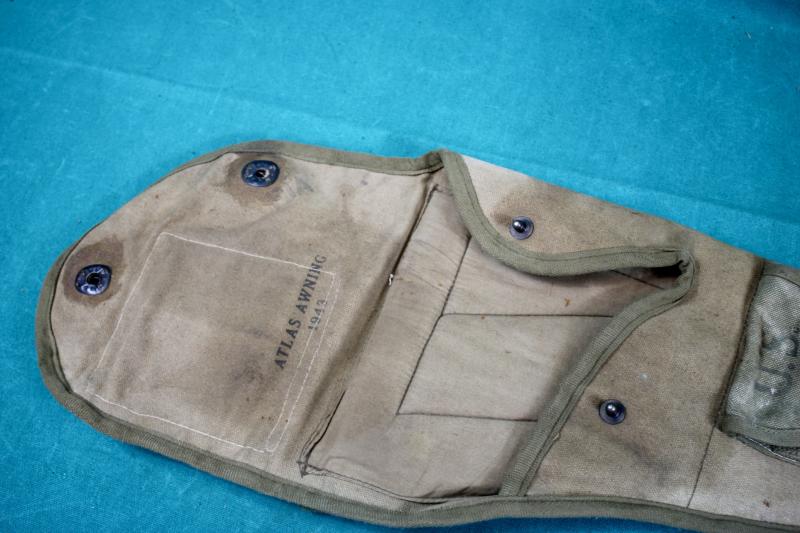 This is a special holster for the folding stock M1C carbine for use with paratroopers, which was adopted in February 1943. This example was been period modified with the addition of two M1 carbine twin magazine pouches which have been stitched to the holster. The holster is maker marked "Atlas Awning" and dated 1943.