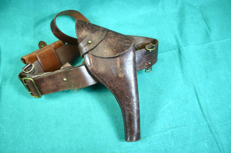 This a British officers Sam Brown set consisting of a 1916 dated belt which has a faint makers stamp, cross-strap. MKV1 Webley holster, which is maker marked Hobson & Sons dated 1915, and a ammunition pouch, which is not dated or marker marked. The belt is also named to the original owner.