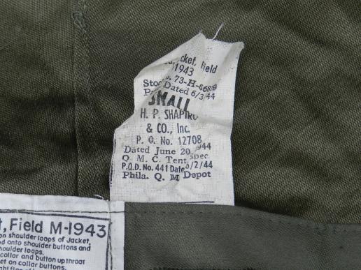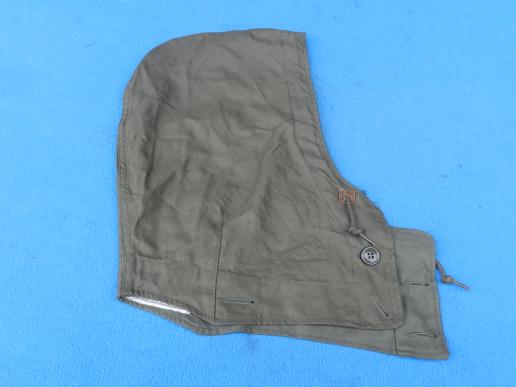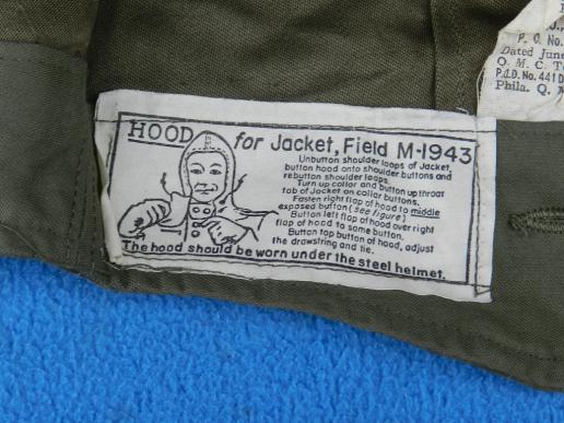 This is a un-issued M43 field jacket hood. This example retains it's instruction and data labels and is dated 6th March 1943. It is size stamped "Small" and was produced by "H.P.SHAPIRO.
